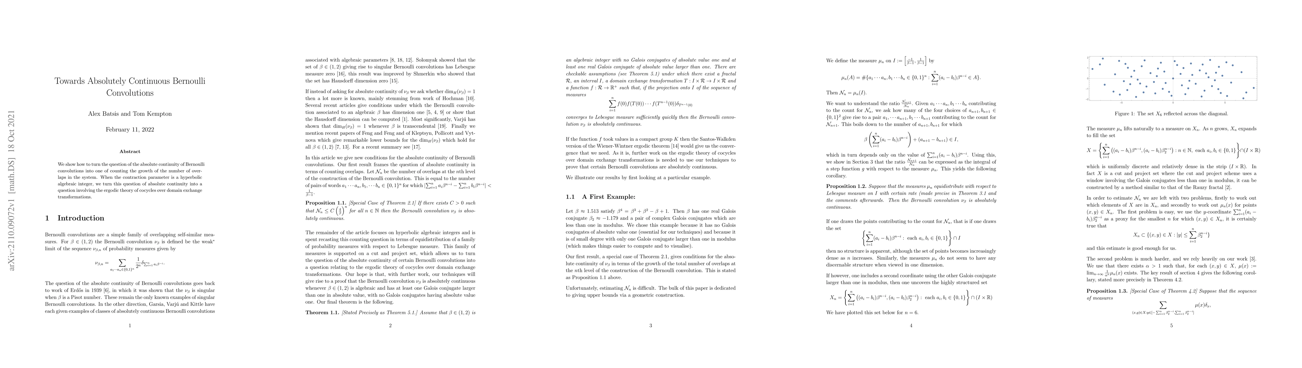 This paper investigates the absolute continuity of Bernoulli convolutions by relating it to the counting of overlaps in the system. It demonstrates that when the contraction parameter is a hyperbolic algebraic integer, the problem can be addressed through the ergodic theory of cocycles over domain exchange transformations.