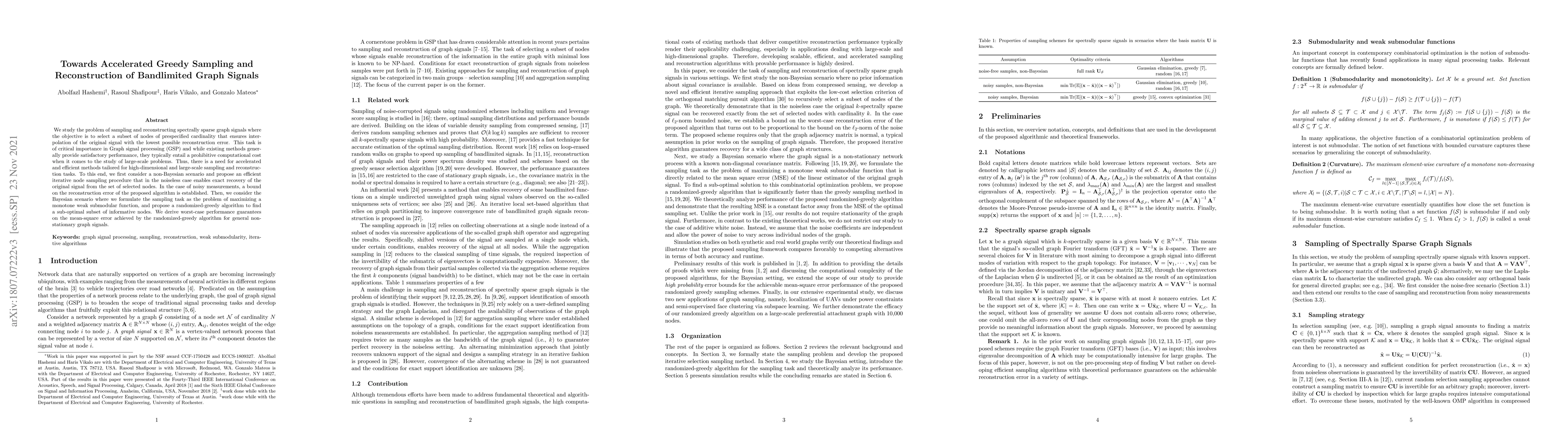 This paper proposes efficient methods for sampling and reconstructing spectrally sparse graph signals, focusing on reducing computational costs for large-scale problems. It introduces an iterative node sampling procedure for exact recovery in noiseless scenarios and a randomized-greedy algorithm for sub-optimal sampling in noisy settings, providing performance guarantees for both approaches.