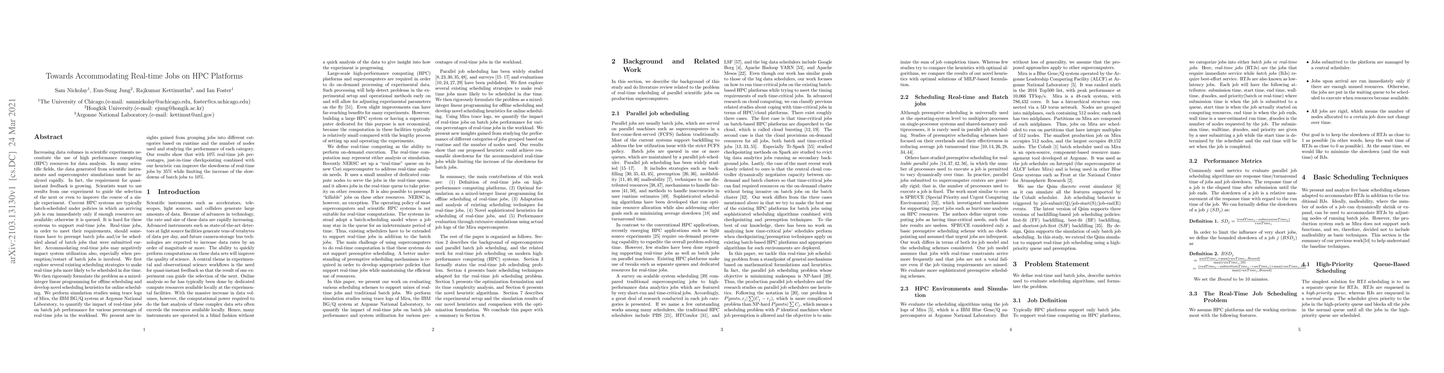 This paper explores strategies to accommodate real-time jobs on HPC platforms, proposing scheduling heuristics and mixed-integer linear programming for offline scheduling. Simulation results show that with 10% real-time jobs, just-in-time checkpointing and heuristics can reduce real-time job slowdowns by 35% while limiting batch job slowdowns to 10%.