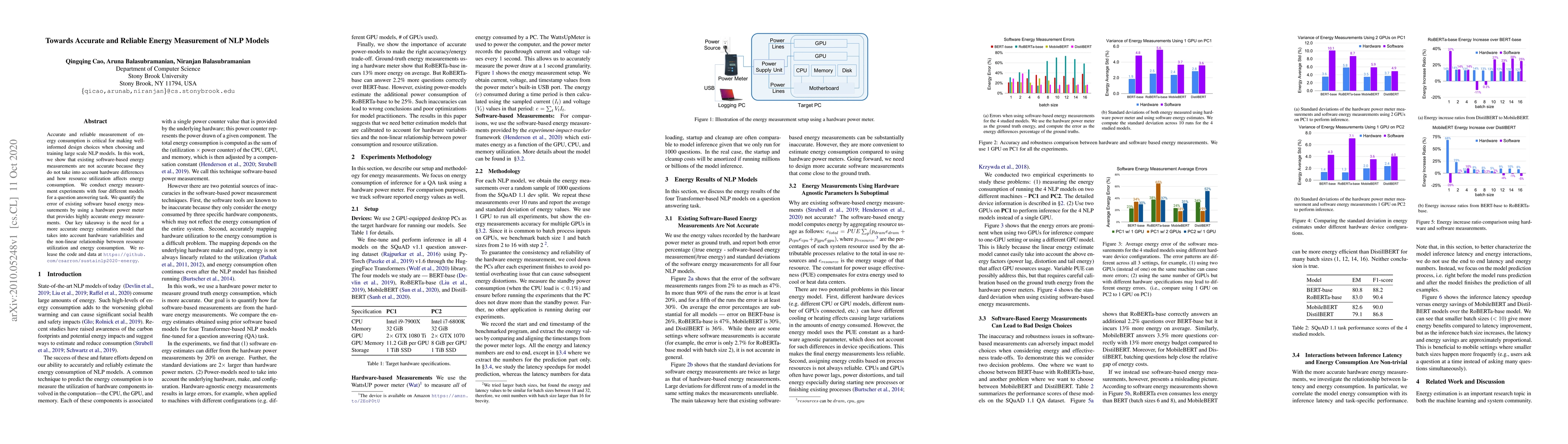 Accurate and reliable measurement of energy consumption is critical for making well-informed design choices when choosing and training large scale NLP models. In this work, we show that existing software-based energy measurements are not accurate because they do not take into account hardware differences and how resource utilization affects energy consumption. We conduct energy measurement experiments with four different models for a question answering task. We quantify the error of existing software-based energy measurements by using a hardware power meter that provides highly accurate energy measurements. Our key takeaway is the need for a more accurate energy estimation model that takes into account hardware variabilities and the non-linear relationship between resource utilization and energy consumption. We release the code and data at https://github.com/csarron/sustainlp2020-energy.