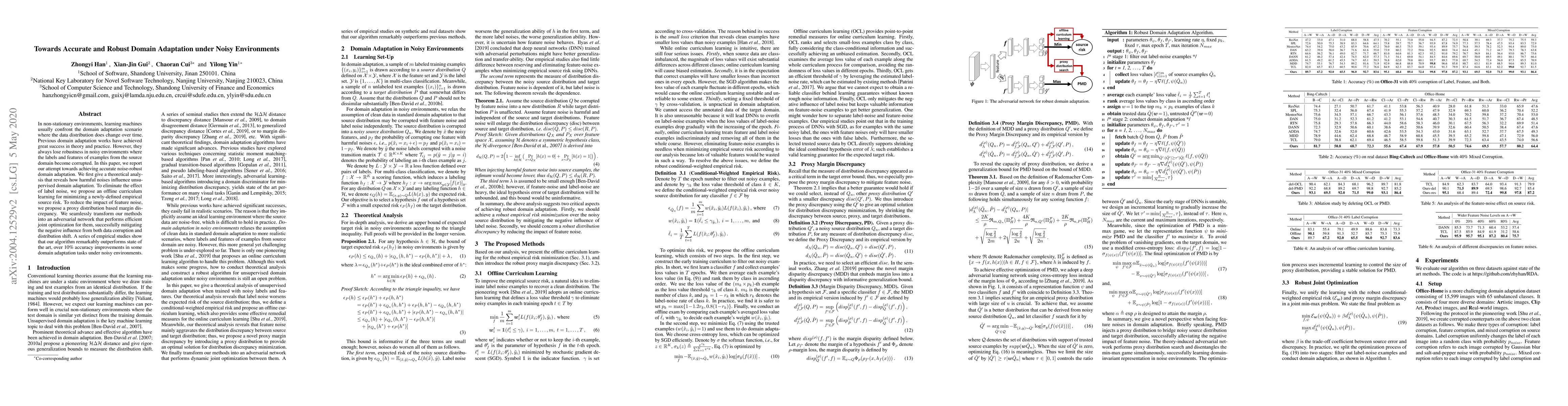 In non-stationary environments, learning machines usually confront the domain adaptation scenario where the data distribution does change over time. Previous domain adaptation works have achieved great success in theory and practice. However, they always lose robustness in noisy environments where the labels and features of examples from the source domain become corrupted. In this paper, we report our attempt towards achieving accurate noise-robust domain adaptation. We first give a theoretical analysis that reveals how harmful noises influence unsupervised domain adaptation. To eliminate the effect of label noise, we propose an offline curriculum learning for minimizing a newly-defined empirical source risk. To reduce the impact of feature noise, we propose a proxy distribution based margin discrepancy. We seamlessly transform our methods into an adversarial network that performs efficient joint optimization for them, successfully mitigating the negative influence from both data corruption and distribution shift. A series of empirical studies show that our algorithm remarkably outperforms state of the art, over 10% accuracy improvements in some domain adaptation tasks under noisy environments.