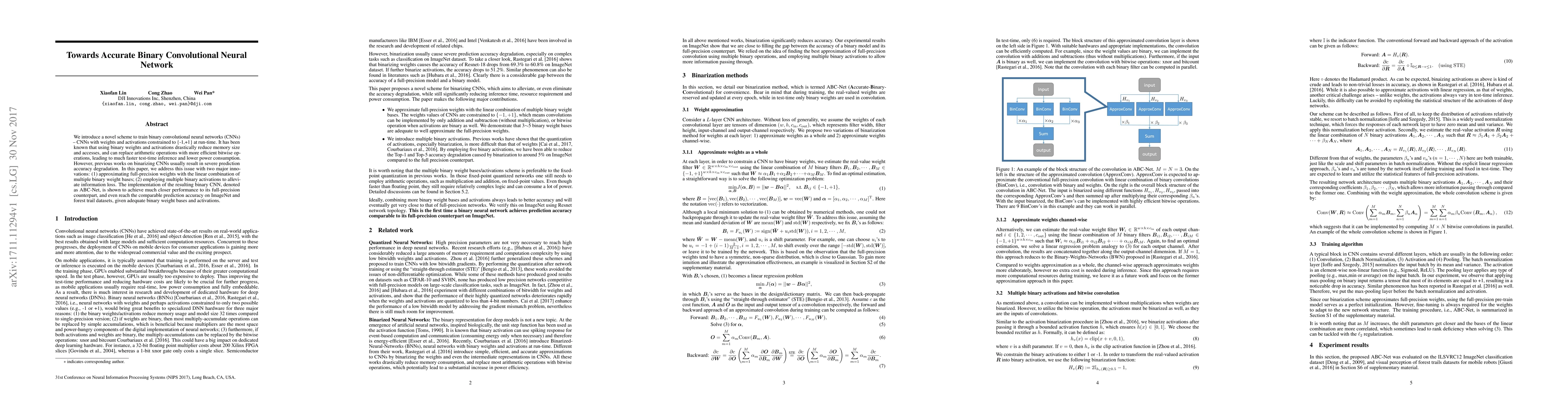 A new method for training binary convolutional neural networks improves their accuracy by using multiple binary weight bases and activations, achieving comparable performance to full-precision models on certain datasets.