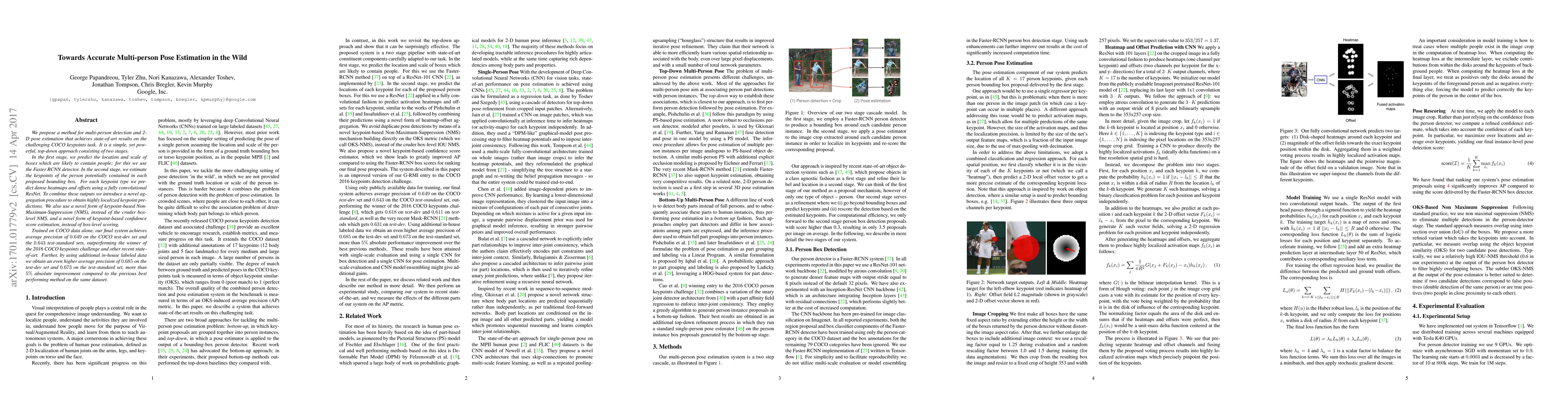 We propose a method for multi-person detection and 2-D pose estimation that achieves state-of-art results on the challenging COCO keypoints task. It is a simple, yet powerful, top-down approach consisting of two stages. In the first stage, we predict the location and scale of boxes which are likely to contain people; for this we use the Faster RCNN detector. In the second stage, we estimate the keypoints of the person potentially contained in each proposed bounding box. For each keypoint type we predict dense heatmaps and offsets using a fully convolutional ResNet. To combine these outputs we introduce a novel aggregation procedure to obtain highly localized keypoint predictions. We also use a novel form of keypoint-based Non-Maximum-Suppression (NMS), instead of the cruder box-level NMS, and a novel form of keypoint-based confidence score estimation, instead of box-level scoring. Trained on COCO data alone, our final system achieves average precision of 0.649 on the COCO test-dev set and the 0.643 test-standard sets, outperforming the winner of the 2016 COCO keypoints challenge and other recent state-of-art. Further, by using additional in-house labeled data we obtain an even higher average precision of 0.685 on the test-dev set and 0.673 on the test-standard set, more than 5% absolute improvement compared to the previous best performing method on the same dataset.