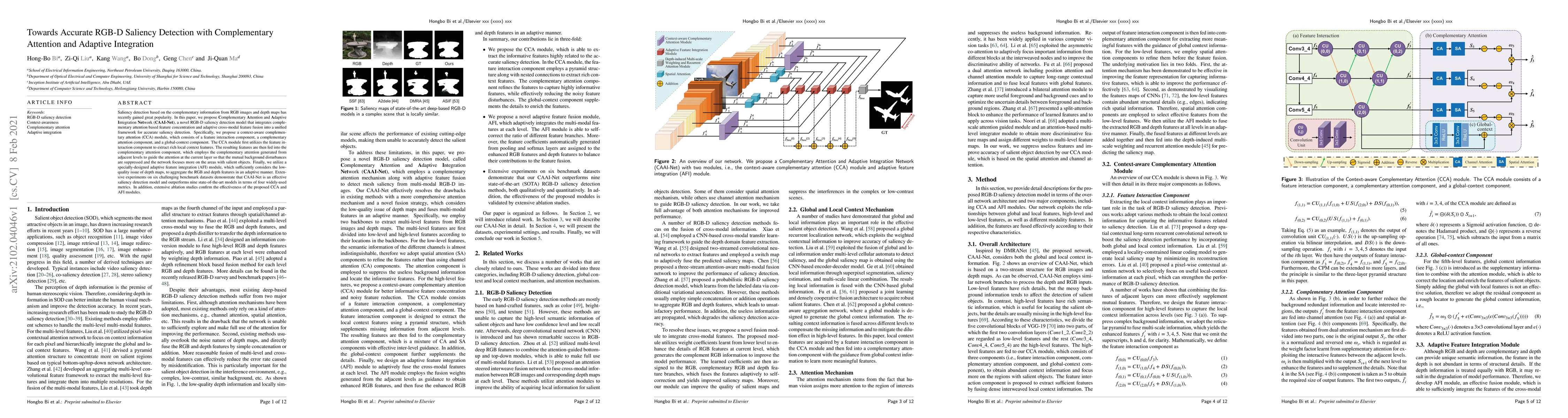 This paper introduces CAAI-Net, a novel RGB-D saliency detection model that employs complementary attention and adaptive integration to enhance accuracy. It features a context-aware complementary attention module for feature concentration and an adaptive feature integration module to address depth map quality issues, outperforming nine state-of-the-art models on six datasets.