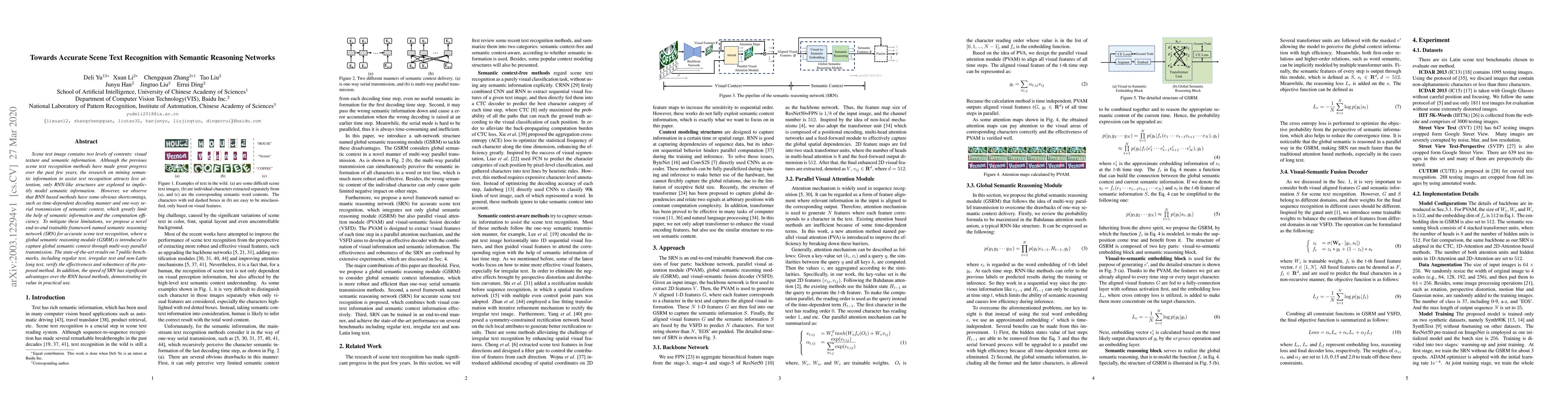 This paper proposes a Semantic Reasoning Network (SRN) framework to enhance scene text recognition by leveraging global semantic context through multi-way parallel transmission, addressing limitations of RNN-based methods. The SRN framework achieves state-of-the-art results on multiple benchmarks and demonstrates faster processing speeds compared to traditional methods.