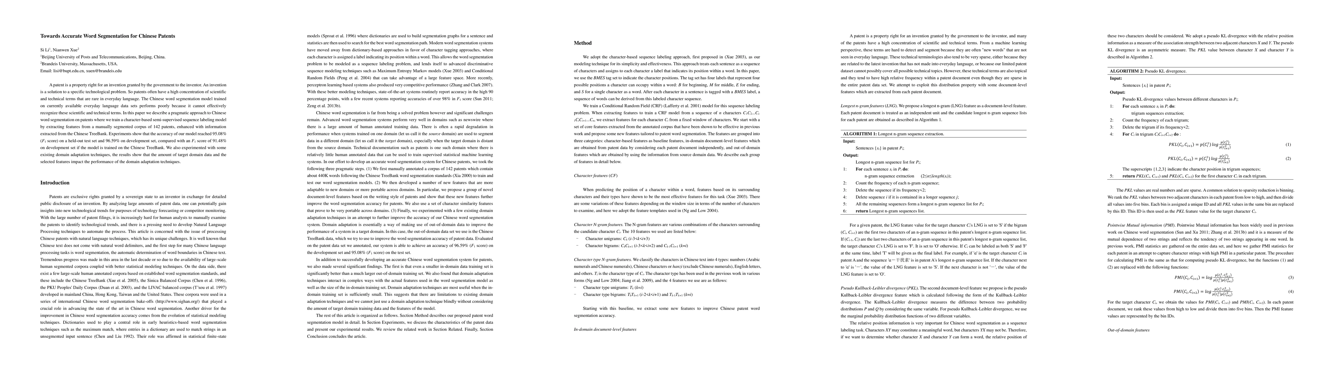 A patent is a property right for an invention granted by the government to the inventor. An invention is a solution to a specific technological problem. So patents often have a high concentration of scientific and technical terms that are rare in everyday language. The Chinese word segmentation model trained on currently available everyday language data sets performs poorly because it cannot effectively recognize these scientific and technical terms. In this paper we describe a pragmatic approach to Chinese word segmentation on patents where we train a character-based semi-supervised sequence labeling model by extracting features from a manually segmented corpus of 142 patents, enhanced with information extracted from the Chinese TreeBank. Experiments show that the accuracy of our model reached 95.08% (F1 score) on a held-out test set and 96.59% on development set, compared with an F1 score of 91.48% on development set if the model is trained on the Chinese TreeBank. We also experimented with some existing domain adaptation techniques, the results show that the amount of target domain data and the selected features impact the performance of the domain adaptation techniques.