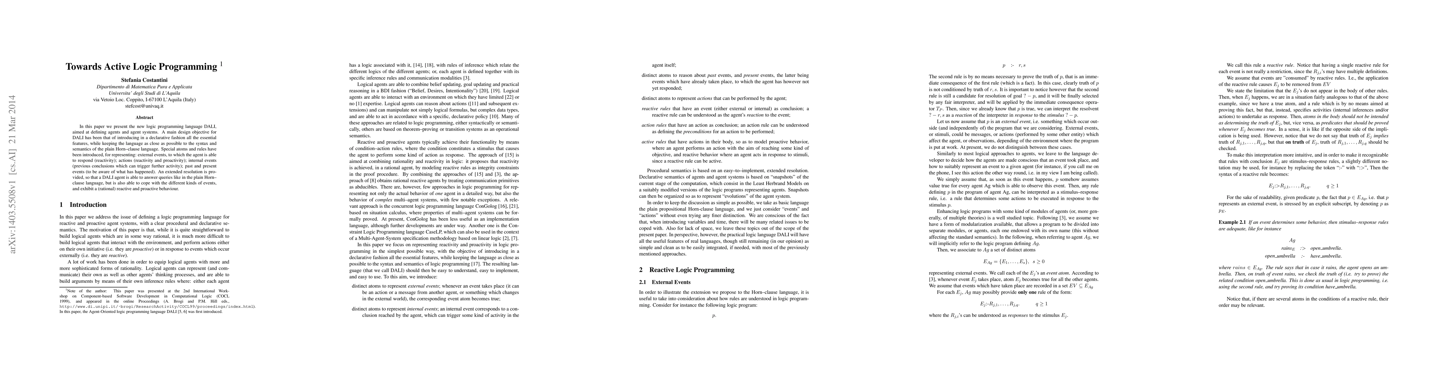 In this paper we present the new logic programming language DALI, aimed at defining agents and agent systems. A main design objective for DALI has been that of introducing in a declarative fashion all the essential features, while keeping the language as close as possible to the syntax and semantics of the plain Horn--clause language. Special atoms and rules have been introduced, for representing: external events, to which the agent is able to respond (reactivity); actions (reactivity and proactivity); internal events (previous conclusions which can trigger further activity); past and present events (to be aware of what has happened). An extended resolution is provided, so that a DALI agent is able to answer queries like in the plain Horn--clause language, but is also able to cope with the different kinds of events, and exhibit a (rational) reactive and proactive behaviour.