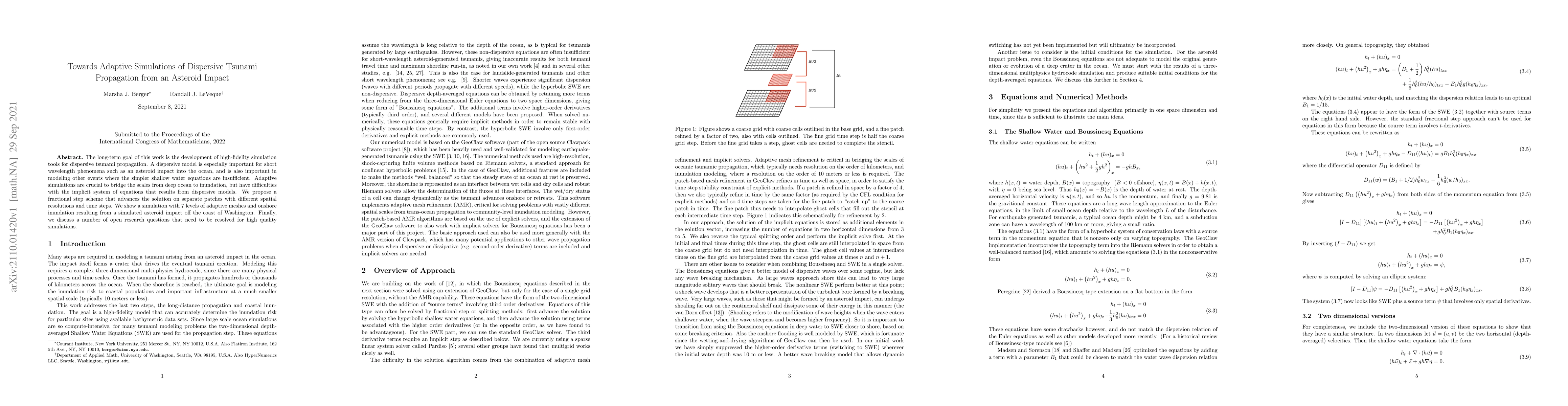 The long-term goal of this work is the development of high-fidelity simulation tools for dispersive tsunami propagation. A dispersive model is especially important for short wavelength phenomena such as an asteroid impact into the ocean, and is also important in modeling other events where the simpler shallow water equations are insufficient. Adaptive simulations are crucial to bridge the scales from deep ocean to inundation, but have difficulties with the implicit system of equations that results from dispersive models. We propose a fractional step scheme that advances the solution on separate patches with different spatial resolutions and time steps. We show a simulation with 7 levels of adaptive meshes and onshore inundation resulting from a simulated asteroid impact off the coast of Washington. Finally, we discuss a number of open research questions that need to be resolved for high quality simulations.