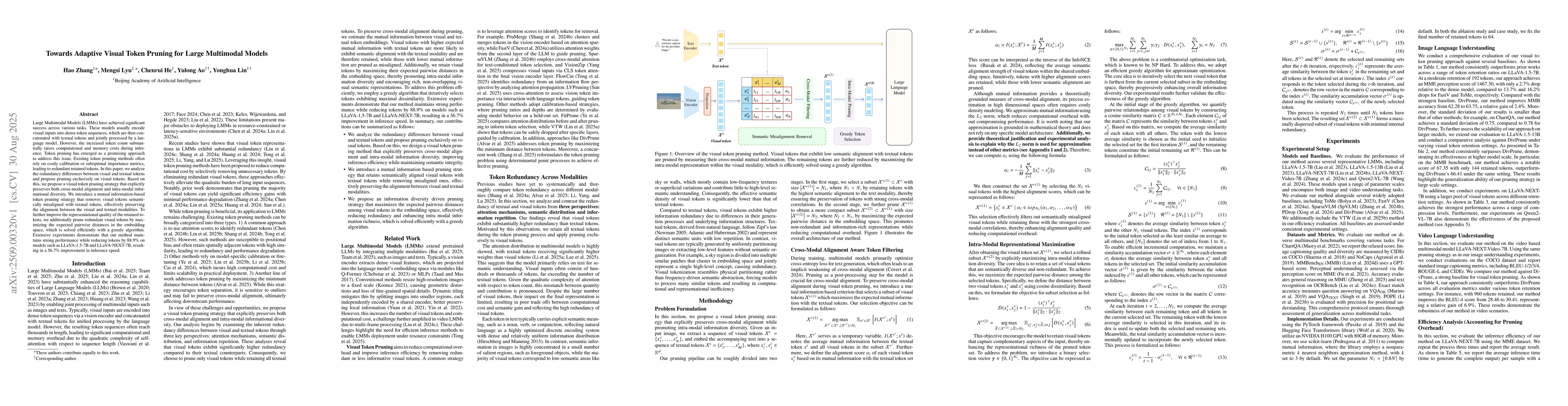Large Multimodal Models (LMMs) have achieved significant success across various tasks. These models usually encode visual inputs into dense token sequences, which are then concatenated with textual tokens and jointly processed by a language model. However, the increased token count substantially raises computational and memory costs during inference. Token pruning has emerged as a promising approach to address this issue. Existing token pruning methods often rely on costly calibration or suboptimal importance metrics, leading to redundant retained tokens. In this paper, we analyze the redundancy differences between visual and textual tokens and propose pruning exclusively on visual tokens. Based on this, we propose a visual token pruning strategy that explicitly preserves both cross-modal alignment and intra-modal informational diversity. We introduce a mutual information-based token pruning strategy that removes visual tokens semantically misaligned with textual tokens, effectively preserving the alignment between the visual and textual modalities. To further improve the representational quality of the retained tokens, we additionally prune redundant visual tokens by maximizing the expected pairwise distances in the embedding space, which is solved efficiently with a greedy algorithm. Extensive experiments demonstrate that our method maintains strong performance while reducing tokens by 88.9% on models such as LLaVA-1.5-7B and LLaVA-NEXT-7B, resulting in a 56.7% improvement in inference speed.