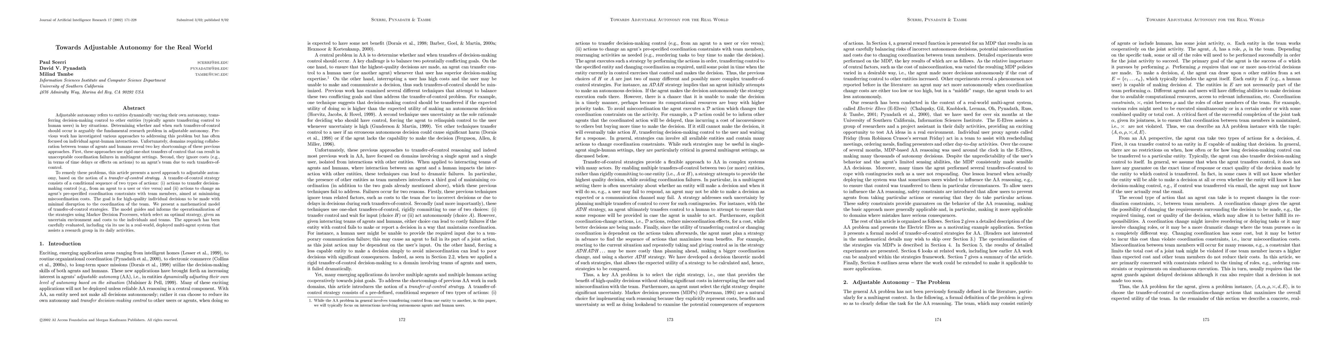A new approach to adjustable autonomy is presented, focusing on a transfer-of-control strategy that minimizes miscoordination costs while achieving high-quality individual decisions. The method uses Markov Decision Processes to select an optimal strategy in uncertain environments.