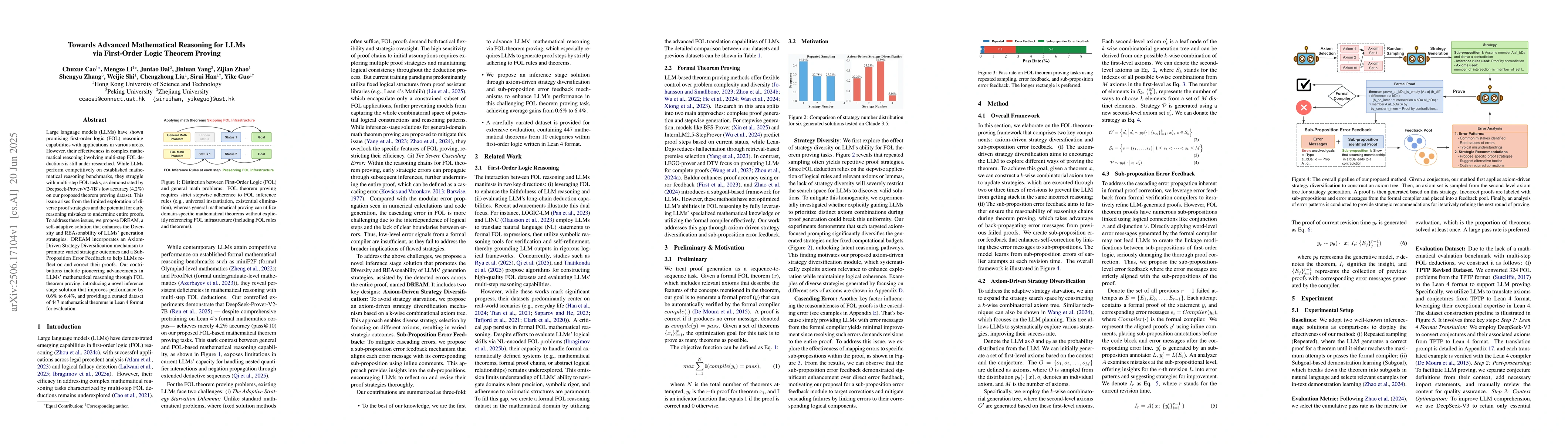 Large language models (LLMs) have shown promising first-order logic (FOL) reasoning capabilities with applications in various areas. However, their effectiveness in complex mathematical reasoning involving multi-step FOL deductions is still under-researched. While LLMs perform competitively on established mathematical reasoning benchmarks, they struggle with multi-step FOL tasks, as demonstrated by Deepseek-Prover-V2-7B's low accuracy (4.2%) on our proposed theorem proving dataset. This issue arises from the limited exploration of diverse proof strategies and the potential for early reasoning mistakes to undermine entire proofs. To address these issues, we propose DREAM, a self-adaptive solution that enhances the Diversity and REAsonability of LLMs' generation strategies. DREAM incorporates an Axiom-Driven Strategy Diversification mechanism to promote varied strategic outcomes and a Sub-Proposition Error Feedback to help LLMs reflect on and correct their proofs. Our contributions include pioneering advancements in LLMs' mathematical reasoning through FOL theorem proving, introducing a novel inference stage solution that improves performance by 0.6% to 6.4%, and providing a curated dataset of 447 mathematical theorems in Lean 4 format for evaluation.