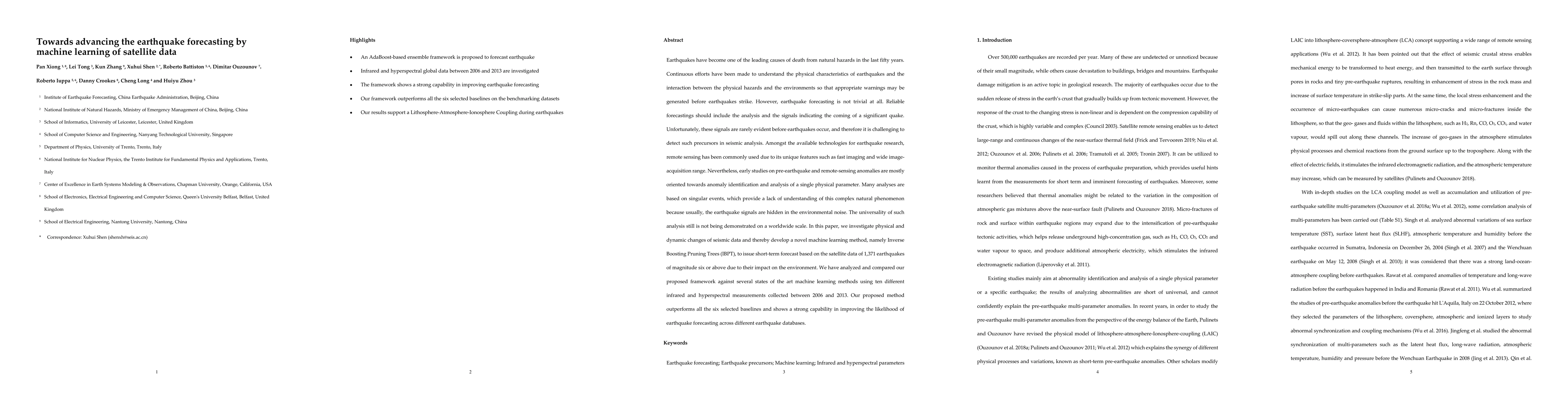 Amongst the available technologies for earthquake research, remote sensing has been commonly used due to its unique features such as fast imaging and wide image-acquisition range. Nevertheless, early studies on pre-earthquake and remote-sensing anomalies are mostly oriented towards anomaly identification and analysis of a single physical parameter. Many analyses are based on singular events, which provide a lack of understanding of this complex natural phenomenon because usually, the earthquake signals are hidden in the environmental noise. The universality of such analysis still is not being demonstrated on a worldwide scale. In this paper, we investigate physical and dynamic changes of seismic data and thereby develop a novel machine learning method, namely Inverse Boosting Pruning Trees (IBPT), to issue short-term forecast based on the satellite data of 1,371 earthquakes of magnitude six or above due to their impact on the environment. We have analyzed and compared our proposed framework against several states of the art machine learning methods using ten different infrared and hyperspectral measurements collected between 2006 and 2013. Our proposed method outperforms all the six selected baselines and shows a strong capability in improving the likelihood of earthquake forecasting across different earthquake databases.