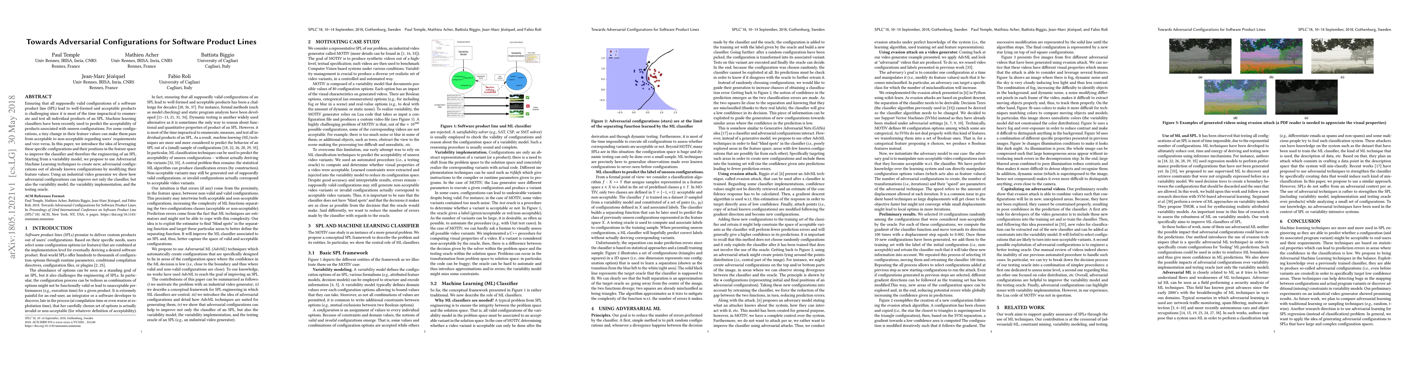 Ensuring that all supposedly valid configurations of a software product line (SPL) lead to well-formed and acceptable products is challenging since it is most of the time impractical to enumerate and test all individual products of an SPL. Machine learning classifiers have been recently used to predict the acceptability of products associated with unseen configurations. For some configurations, a tiny change in their feature values can make them pass from acceptable to non-acceptable regarding users' requirements and vice-versa. In this paper, we introduce the idea of leveraging these specific configurations and their positions in the feature space to improve the classifier and therefore the engineering of an SPL. Starting from a variability model, we propose to use Adversarial Machine Learning techniques to create new, adversarial configurations out of already known configurations by modifying their feature values. Using an industrial video generator we show how adversarial configurations can improve not only the classifier, but also the variability model, the variability implementation, and the testing oracle.