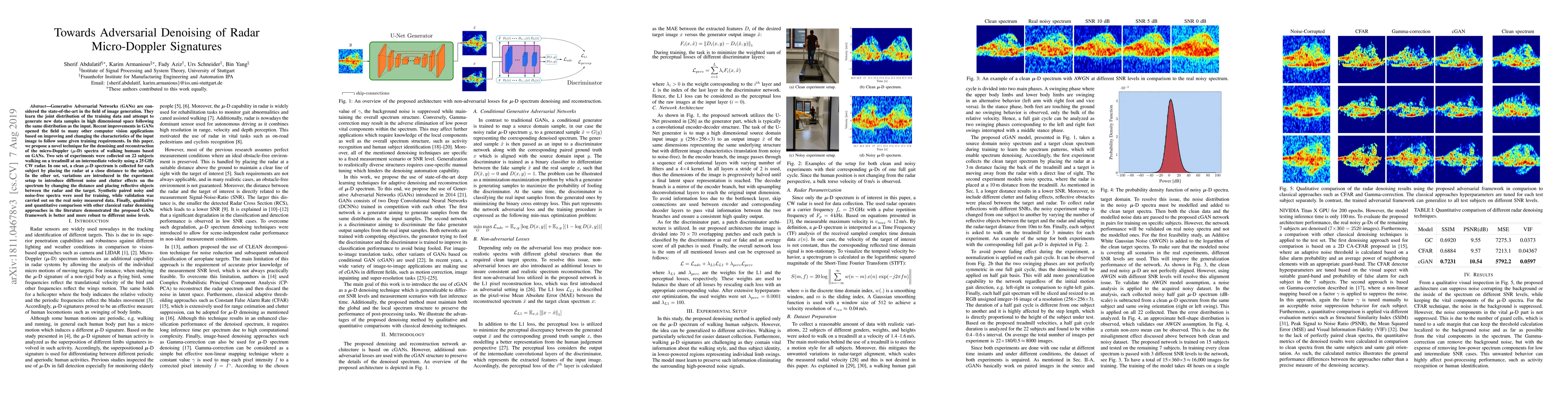 This paper proposes a novel technique using Generative Adversarial Networks (GANs) for denoising and reconstructing micro-Doppler spectra of walking humans, demonstrating superior performance compared to classical radar denoising methods. Experiments involved collecting noisy and clean radar spectra from 22 subjects, with validation on real noisy data showing the robustness of the proposed GAN framework.