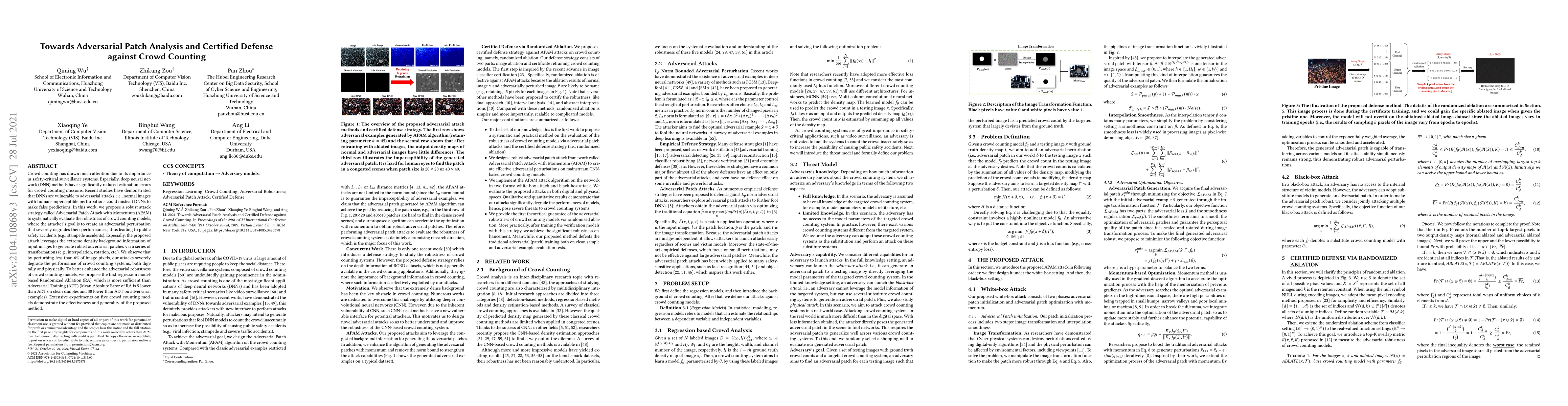 This paper proposes a novel Adversarial Patch Attack with Momentum (APAM) to evaluate the robustness of crowd counting models against adversarial attacks, showing that less than 6% of pixel perturbations can severely degrade model performance. To enhance robustness, it introduces Randomized Ablation (RA), which outperforms Adversarial Training (ADT) significantly, as demonstrated by lower Mean Absolute Error on clean and adversarial samples.