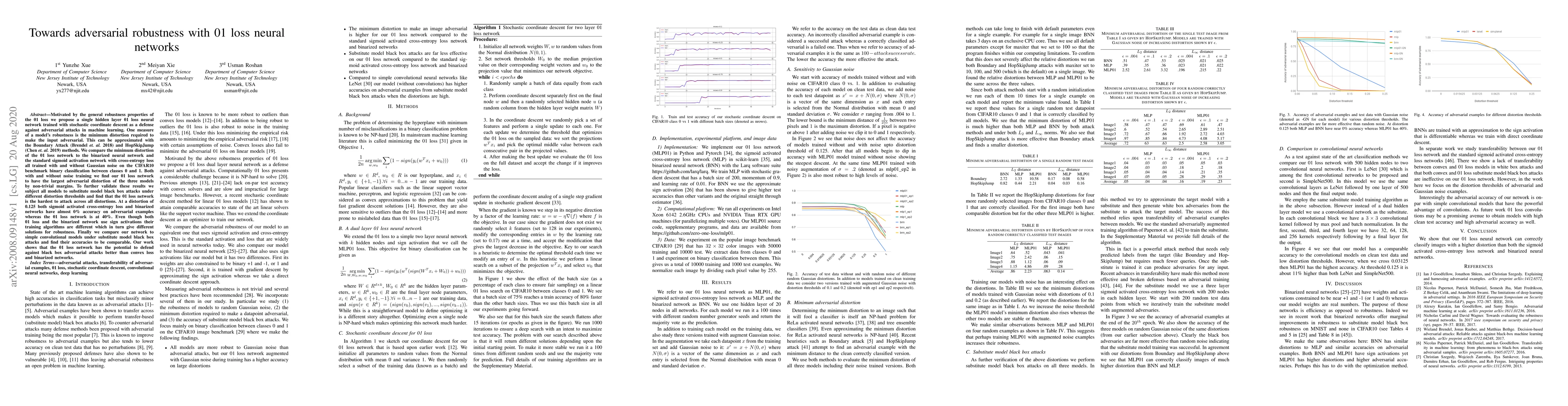 This paper proposes a single hidden layer 01 loss neural network trained with stochastic coordinate descent to defend against adversarial attacks. The 01 loss network shows superior robustness compared to binarized networks and standard sigmoid networks, maintaining 40% accuracy at a distortion of 0.125 when others fail, indicating its potential for black box attack defense.