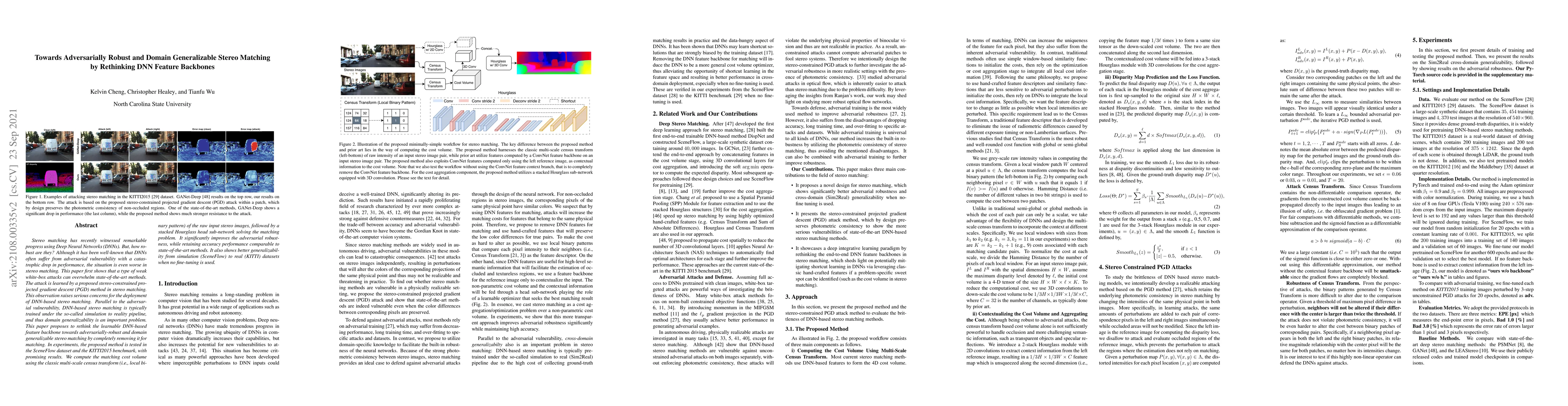 The paper proposes a novel stereo matching workflow that combines classic multi-scale census transform features with end-to-end trainable DNNs, aiming for adversarial robustness and cross-domain generalizability. It removes the DNN feature backbone used in computing the cost volume for the matching stage to address adversarial vulnerabilities.