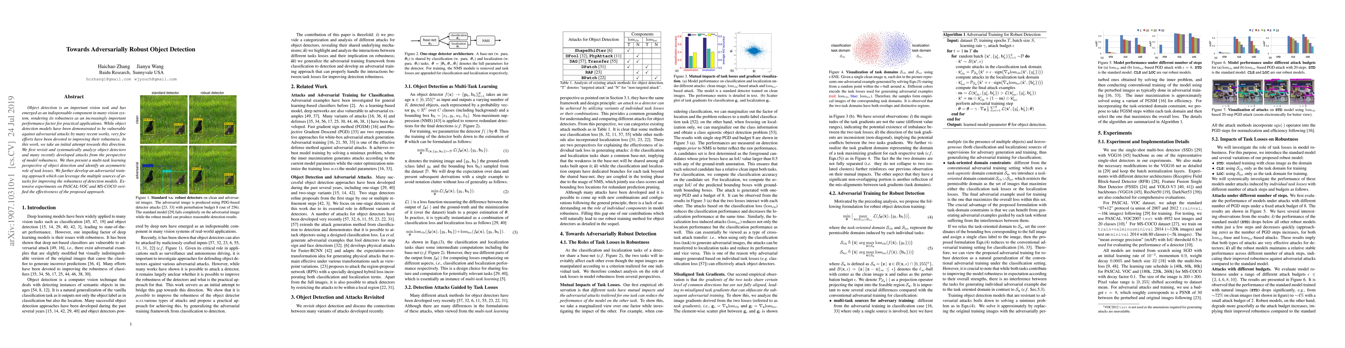 Object detection is an important vision task and has emerged as an indispensable component in many vision system, rendering its robustness as an increasingly important performance factor for practical applications. While object detection models have been demonstrated to be vulnerable against adversarial attacks by many recent works, very few efforts have been devoted to improving their robustness. In this work, we take an initial attempt towards this direction. We first revisit and systematically analyze object detectors and many recently developed attacks from the perspective of model robustness. We then present a multi-task learning perspective of object detection and identify an asymmetric role of task losses. We further develop an adversarial training approach which can leverage the multiple sources of attacks for improving the robustness of detection models. Extensive experiments on PASCAL-VOC and MS-COCO verified the effectiveness of the proposed approach.
