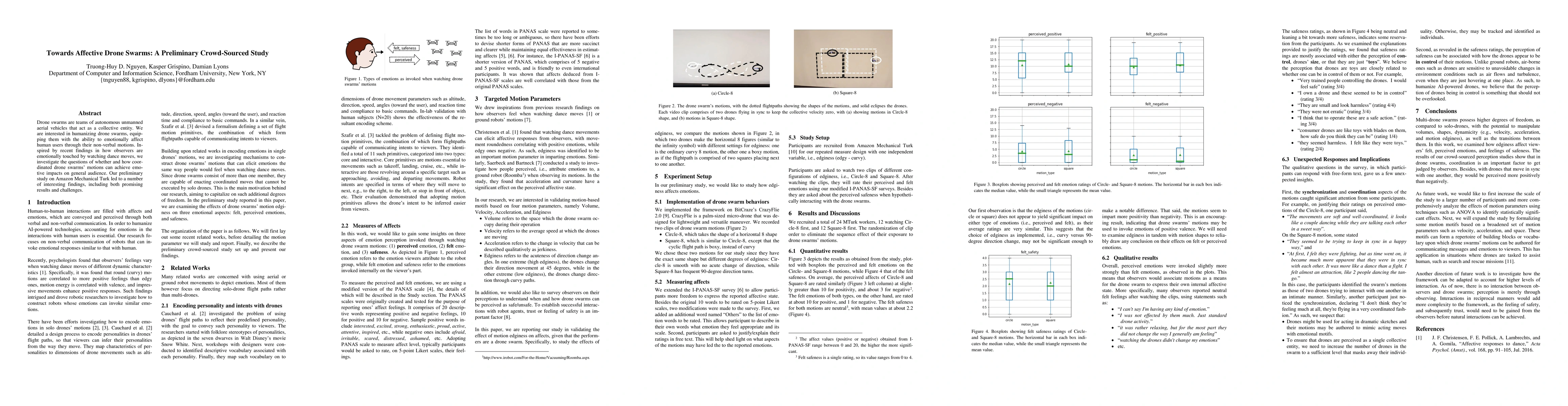 Drone swarms are teams of autonomous un-manned aerial vehicles that act as a collective entity. We are interested in humanizing drone swarms, equipping them with the ability to emotionally affect human users through their non-verbal motions. Inspired by recent findings in how observers are emotionally touched by watching dance moves, we investigate the questions of whether and how coordinated drone swarms' motions can achieve emotive impacts on general audience. Our preliminary study on Amazon Mechanical Turk led to a number of interesting findings, including both promising results and challenges.