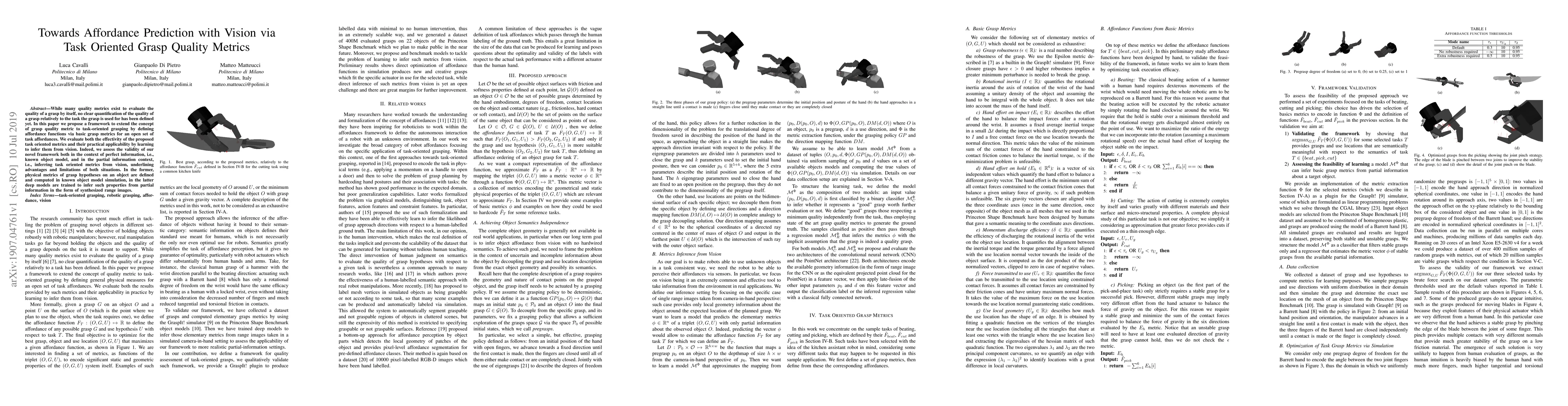 While many quality metrics exist to evaluate the quality of a grasp by itself, no clear quantification of the quality of a grasp relatively to the task the grasp is used for has been defined yet. In this paper we propose a framework to extend the concept of grasp quality metric to task-oriented grasping by defining affordance functions via basic grasp metrics for an open set of task affordances. We evaluate both the effectivity of the proposed task oriented metrics and their practical applicability by learning to infer them from vision. Indeed, we assess the validity of our novel framework both in the context of perfect information, i.e., known object model, and in the partial information context, i.e., inferring task oriented metrics from vision, underlining advantages and limitations of both situations. In the former, physical metrics of grasp hypotheses on an object are defined and computed in known object model simulation, in the latter deep models are trained to infer such properties from partial information in the form of synthesized range images.