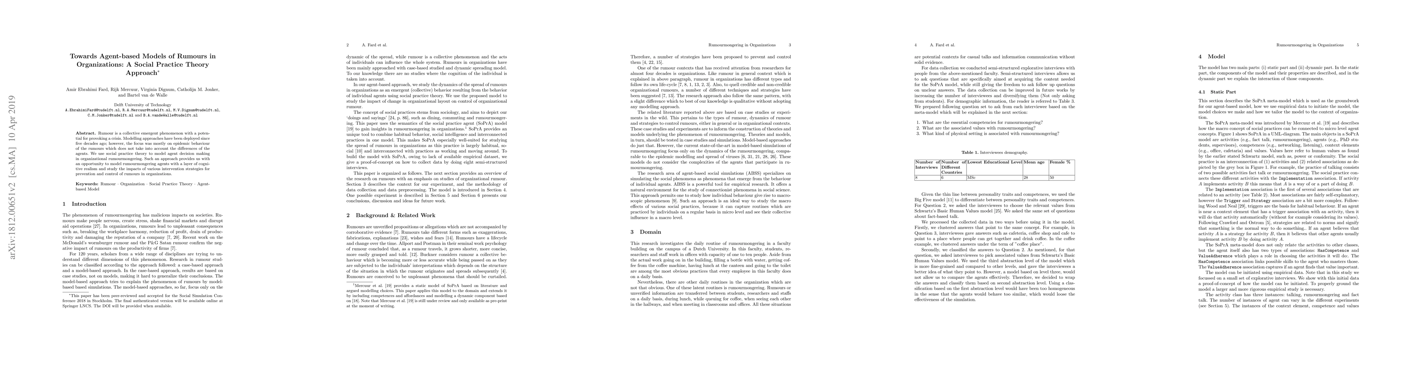 This paper proposes an agent-based model of rumour spread in organizations using social practice theory, aiming to capture the cognitive realism of individual agents and evaluate intervention strategies for rumour prevention and control. The approach seeks to address the limitations of previous epidemic-based models by considering agent differences.