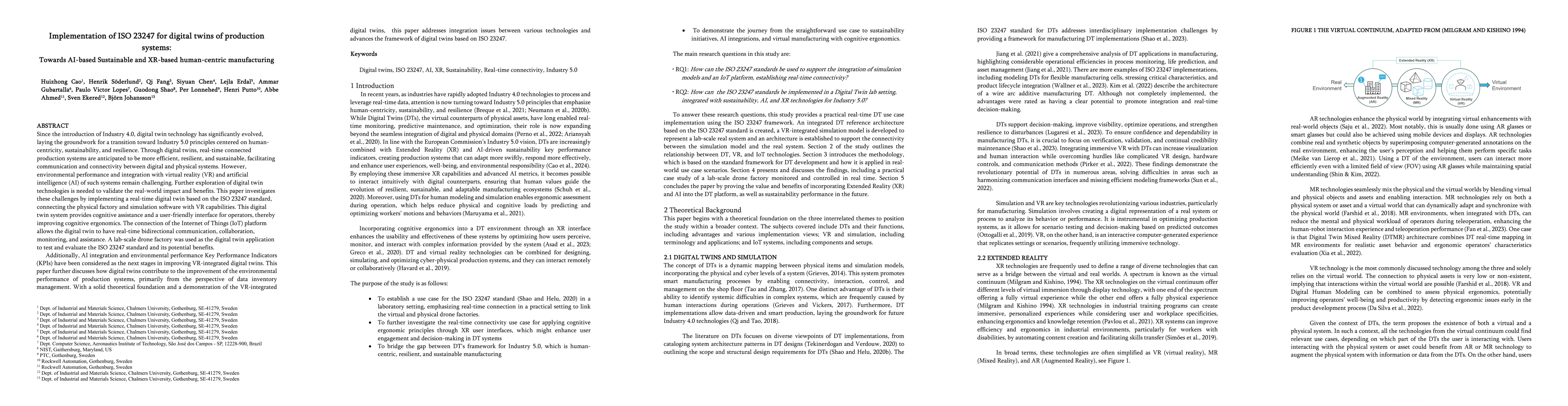 This work differentiates itself by focusing on the implementation of ISO 23247 for digital twins, integrating sustainability, AI, and XR technologies for Industry 5.0, and providing a comprehensive validation of the DT framework.