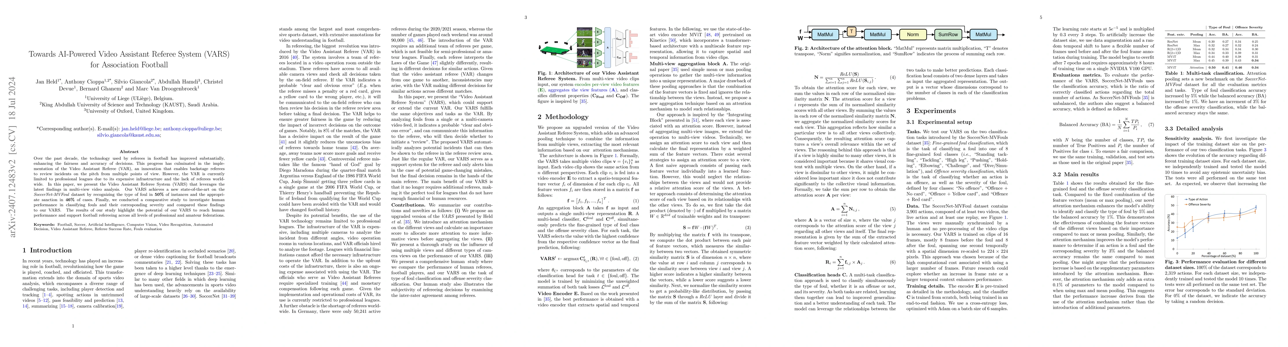This paper introduces a semi-automated AI-powered Video Assistant Referee System (VARS) for football that uses multi-view video analysis to recognize fouls and sanctions, achieving 50% accuracy in foul identification and 46% in sanction appropriateness. Comparative studies show VARS has the potential to match human performance and aid referees at all levels.