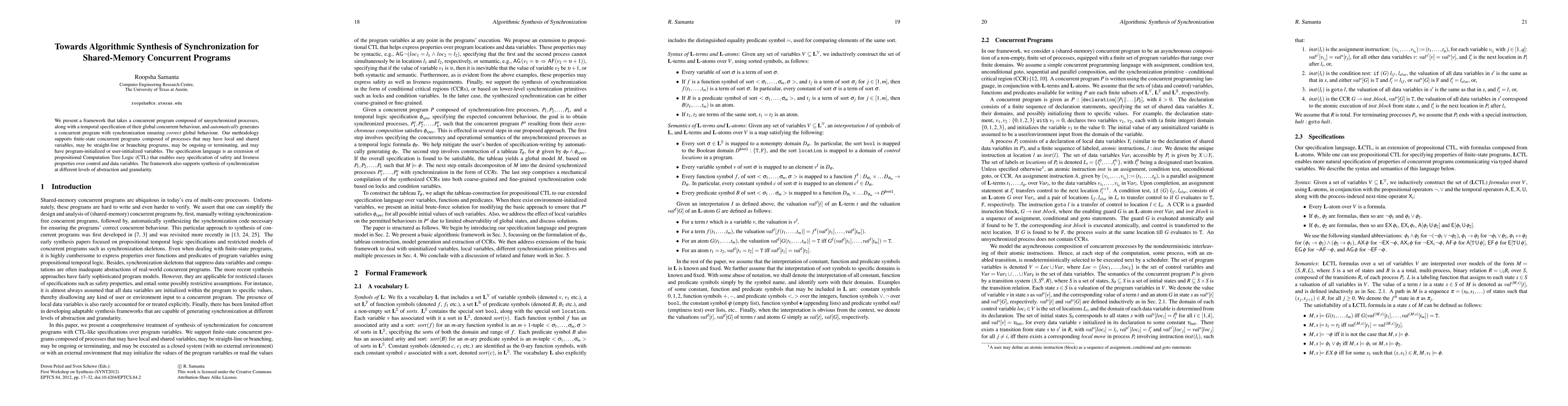 We present a framework that takes a concurrent program composed of unsynchronized processes, along with a temporal specification of their global concurrent behaviour, and automatically generates a concurrent program with synchronization ensuring correct global behaviour. Our methodology supports finite-state concurrent programs composed of processes that may have local and shared variables, may be straight-line or branching programs, may be ongoing or terminating, and may have program-initialized or user-initialized variables. The specification language is an extension of propositional Computation Tree Logic (CTL) that enables easy specification of safety and liveness properties over control and data variables. The framework also supports synthesis of synchronization at different levels of abstraction and granularity.