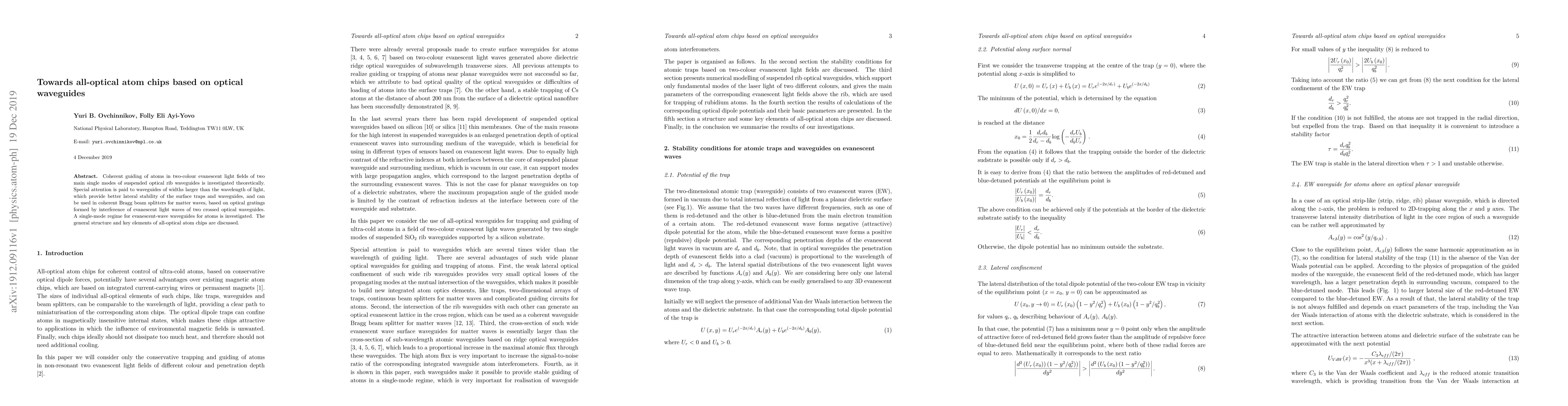 The paper presents a detailed theoretical analysis of all-optical atom chips based on optical waveguides, including the design of waveguide beam splitters for atoms using optical dual-channel directional couplers and Bragg diffraction of atoms at an optical lattice formed by interference of optical modes in crossed optical waveguides.