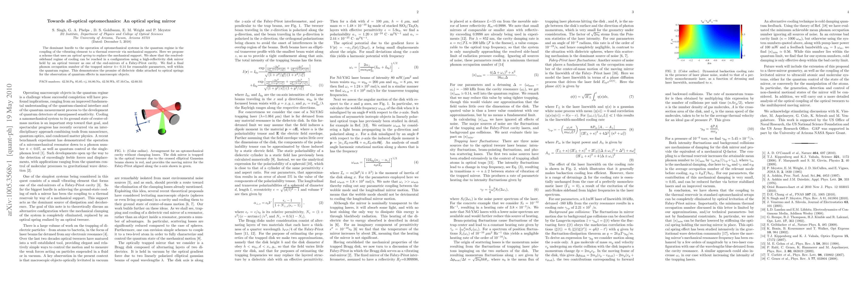 The dominant hurdle to the operation of optomechanical systems in the quantum regime is the coupling of the vibrating element to a thermal reservoir via mechanical supports. Here we propose a scheme that uses an optical spring to replace the mechanical support. We show that the resolved-sideband regime of cooling can be reached in a configuration using a high-reflectivity disk mirror held by an optical tweezer as one of the end-mirrors of a Fabry-Perot cavity. We find a final phonon occupation number of the trapped mirror ${\bar n}$= 0.14 for reasonable parameters, well within the quantum regime. This demonstrates the promise of dielectric disks attached to optical springs for the observation of quantum effects in macroscopic objects.