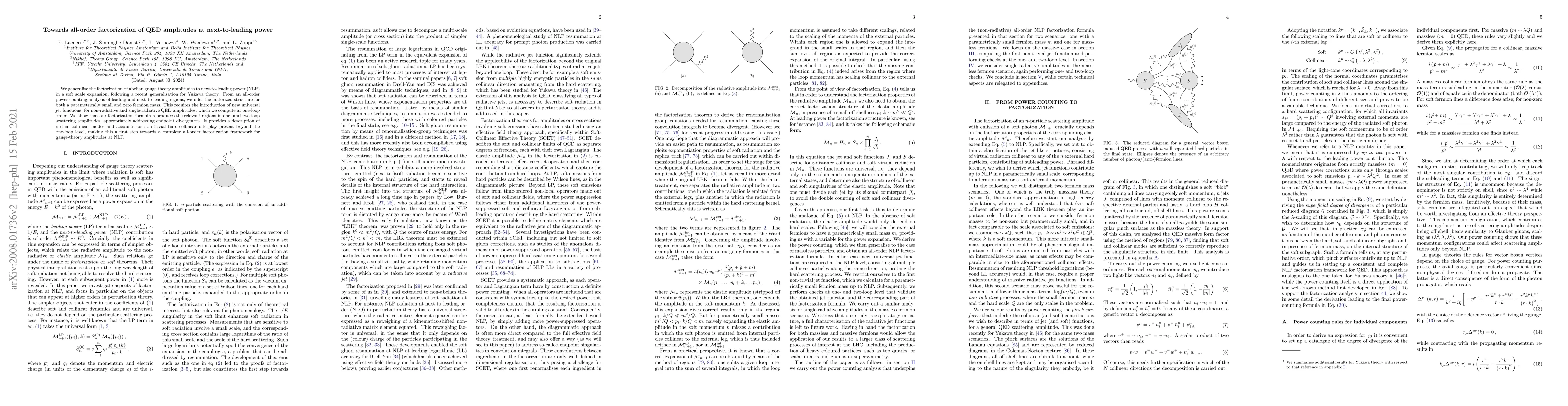 We generalise the factorization of abelian gauge theory amplitudes to next-to-leading power (NLP) in a soft scale expansion, following a recent generalisation for Yukawa theory. From an all-order power counting analysis of leading and next-to-leading regions, we infer the factorized structure for both a parametrically small and zero fermion mass. This requires the introduction of new universal jet functions, for non-radiative and single-radiative QED amplitudes, which we compute at one-loop order. We show that our factorization formula reproduces the relevant regions in one- and two-loop scattering amplitudes, appropriately addressing endpoint divergences. It provides a description of virtual collinear modes and accounts for non-trivial hard-collinear interplay present beyond the one-loop level, making this a first step towards a complete all-order factorization framework for gauge-theory amplitudes at NLP.