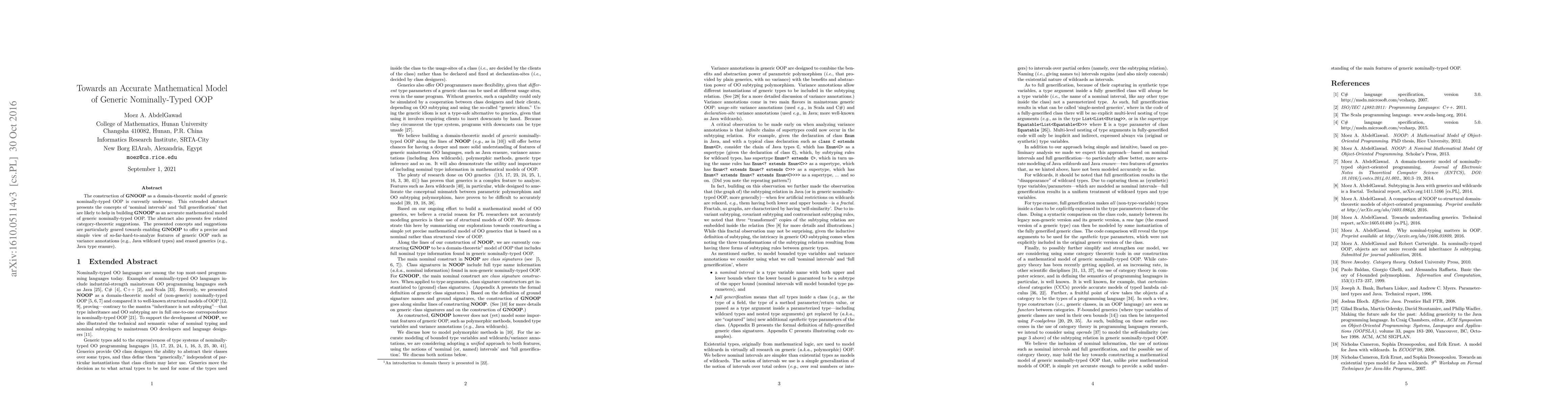 The construction of GNOOP as a domain-theoretic model of generic nominally-typed OOP is currently underway. This extended abstract presents the concepts of `nominal intervals' and `full generication' that are likely to help in building GNOOP as an accurate mathematical model of generic nominally-typed OOP. The abstract also presents few related category-theoretic suggestions. The presented concepts and suggestions are particularly geared towards enabling GNOOP to offer a precise and simple view of so-far-hard-to-analyze features of generic OOP such as variance annotations (e.g., Java wildcard types) and erased generics (e.g., Java type erasure).