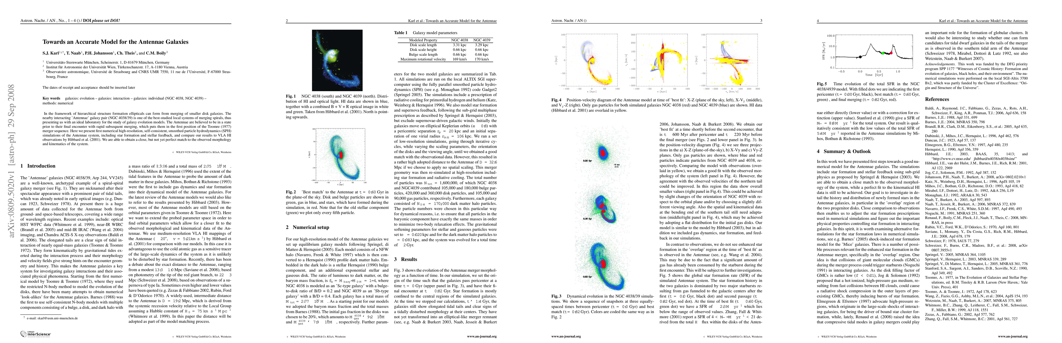 In the framework of hierarchical structure formation ellipticals can form from merging of smaller disk galaxies. The nearby interacting 'Antennae' galaxy pair (NGC 4038/39) is one of the best-studied local systems of merging spirals, thus presenting us with an ideal laboratory for the study of galaxy evolution models. The Antennae are believed to be in a state prior to their final encounter with rapid subsequent merging, which puts them in the first position of the Toomre (1977) merger sequence. Here we present first numerical high-resolution, self-consistent, smoothed particle hydrodynamics (SPH) simulations of the Antennae system, including star formation and stellar feedback, and compare our results to VLA HI observations by Hibbard et al. (2001). We are able to obtain a close, but not yet perfect match to the observed morphology and kinematics of the system.