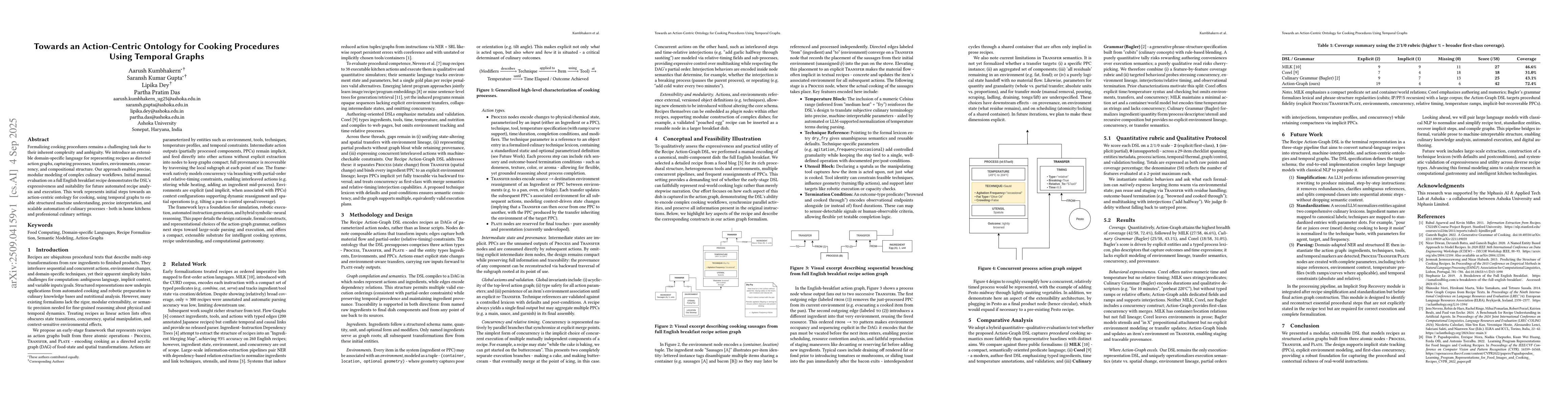 Formalizing cooking procedures remains a challenging task due to their inherent complexity and ambiguity. We introduce an extensible domain-specific language for representing recipes as directed action graphs, capturing processes, transfers, environments, concurrency, and compositional structure. Our approach enables precise, modular modeling of complex culinary workflows. Initial manual evaluation on a full English breakfast recipe demonstrates the DSL's expressiveness and suitability for future automated recipe analysis and execution. This work represents initial steps towards an action-centric ontology for cooking, using temporal graphs to enable structured machine understanding, precise interpretation, and scalable automation of culinary processes - both in home kitchens and professional culinary settings.