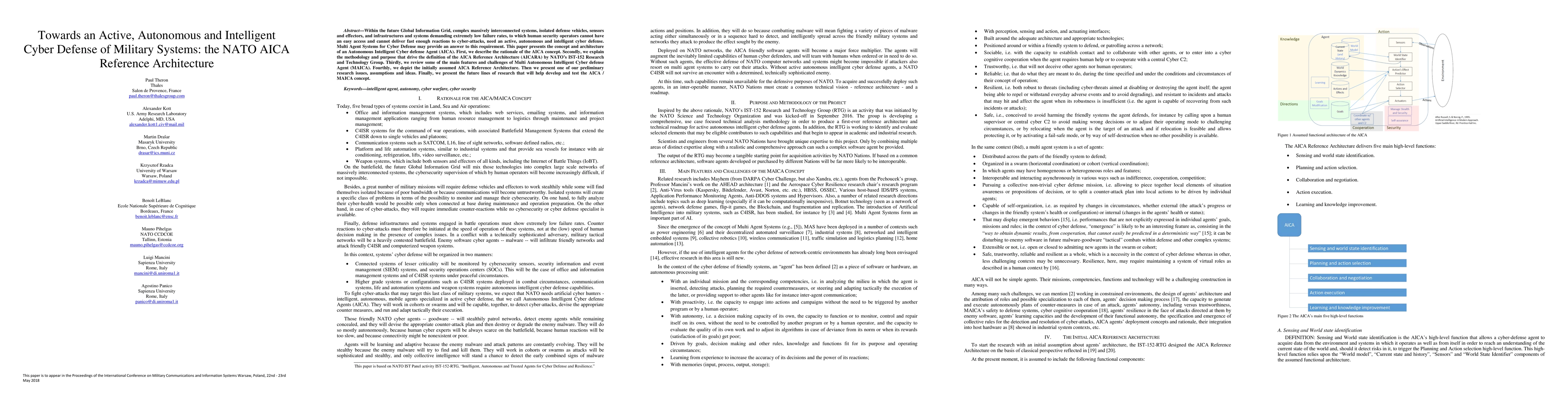 This paper introduces the Autonomous Intelligent Cyber defense Agent (AICA) concept and the NATO AICA Reference Architecture (AICARA) to address the need for active, autonomous, and intelligent defense in complex military systems. It outlines the methodology, main features, and challenges of Multi Agent Systems for Cyber Defense, and presents future research directions for its development.