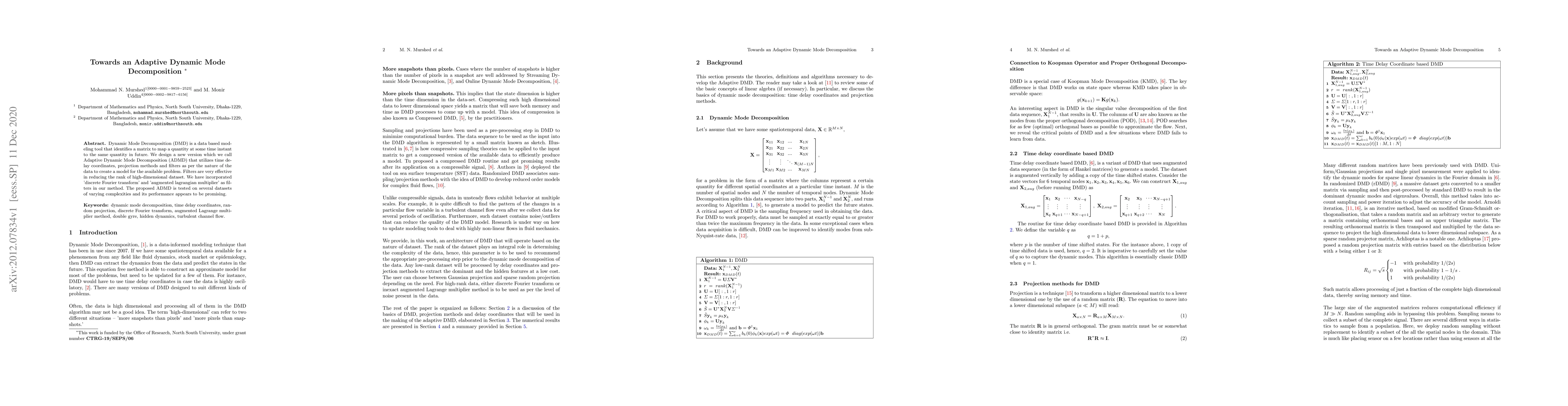 The paper introduces Adaptive Dynamic Mode Decomposition (ADMD), an advanced version of DMD that incorporates time delay coordinates, projection methods, and filters to model dynamic systems. The method uses discrete Fourier transform and augmented Lagrangian multipliers to reduce high-dimensional data rank, showing promising results on various datasets.