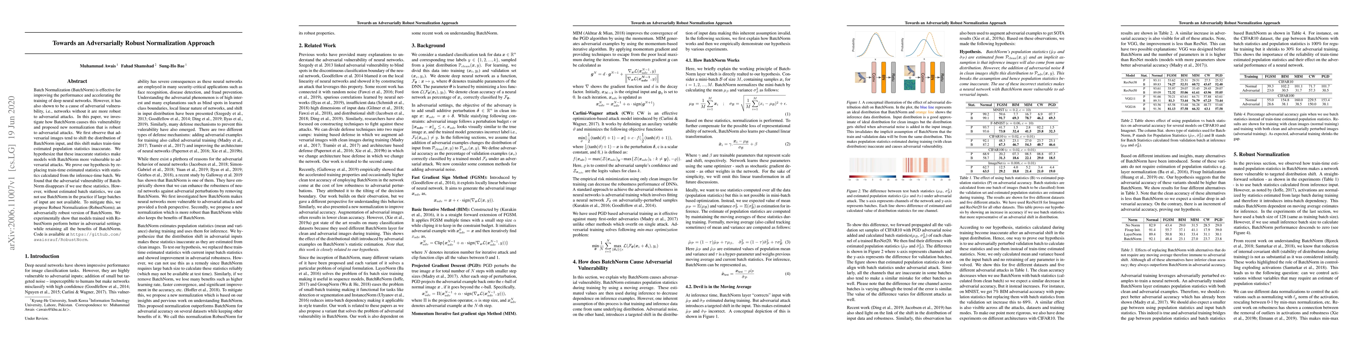 Batch Normalization (BatchNorm) is effective for improving the performance and accelerating the training of deep neural networks. However, it has also shown to be a cause of adversarial vulnerability, i.e., networks without it are more robust to adversarial attacks. In this paper, we investigate how BatchNorm causes this vulnerability and proposed new normalization that is robust to adversarial attacks. We first observe that adversarial images tend to shift the distribution of BatchNorm input, and this shift makes train-time estimated population statistics inaccurate. We hypothesize that these inaccurate statistics make models with BatchNorm more vulnerable to adversarial attacks. We prove our hypothesis by replacing train-time estimated statistics with statistics calculated from the inference-time batch. We found that the adversarial vulnerability of BatchNorm disappears if we use these statistics. However, without estimated batch statistics, we can not use BatchNorm in the practice if large batches of input are not available. To mitigate this, we propose Robust Normalization (RobustNorm); an adversarially robust version of BatchNorm. We experimentally show that models trained with RobustNorm perform better in adversarial settings while retaining all the benefits of BatchNorm. Code is available at \url{https://github.com/awaisrauf/RobustNorm}.
