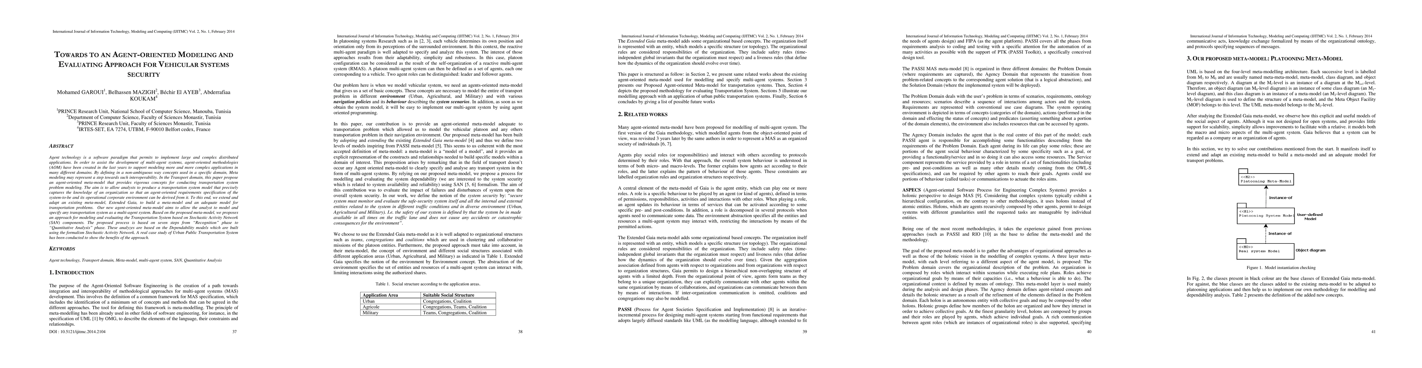 Agent technology is a software paradigm that permits to implement large and complex distributed applications. In order to assist the development of multi-agent systems, agent-oriented methodologies (AOM) have been created in the last years to support modeling more and more complex applications in many different domains. By defining in a non-ambiguous way concepts used in a specific domain, Meta modeling may represent a step towards such interoperability. In the Transport domain, this paper propose an agent-oriented meta-model that provides rigorous concepts for conducting transportation system problem modeling. The aim is to allow analysts to produce a transportation system model that precisely captures the knowledge of an organization so that an agent-oriented requirements specification of the system-to-be and its operational corporate environment can be derived from it. To this end, we extend and adapt an existing meta-model, Extended Gaia, to build a meta-model and an adequate model for transportation problems. Our new agent-oriented meta-model aims to allow the analyst to model and specify any transportation system as a multi-agent system. Based on the proposed meta-model, we proposes an approach for modeling and evaluating the Transportation System based on Stochastic Activity Network (SAN) components. The proposed process is based on seven steps from Recognition phase to Quantitative Analysis phase. These analyzes are based on the Dependability models which are built using the formalism Stochastic Activity Network. A real case study of Urban Public Transportation System has been conducted to show the benefits of the approach.