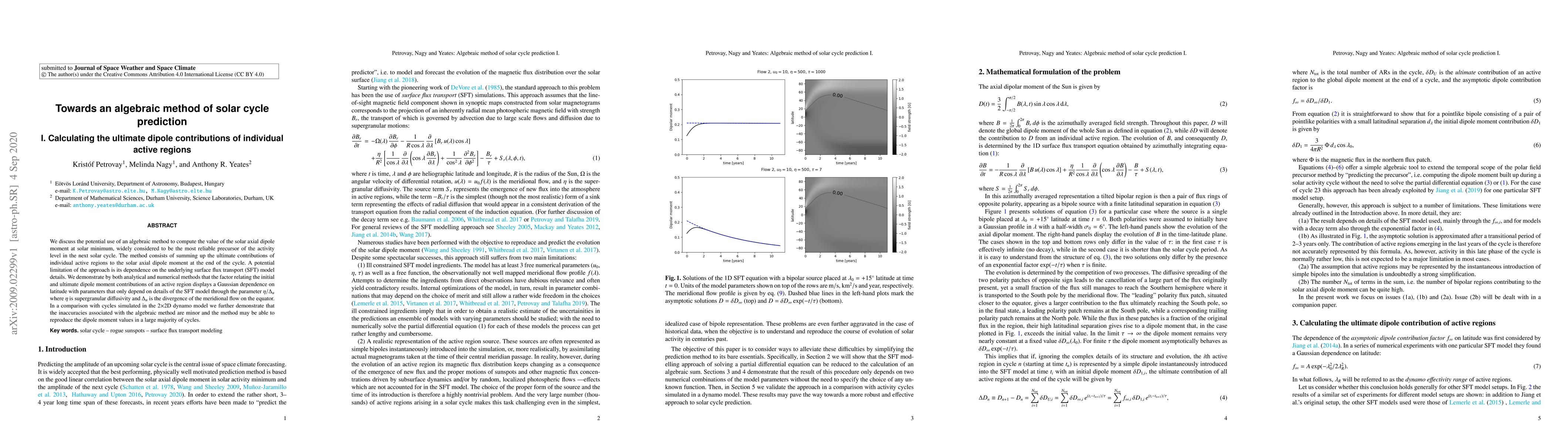 We discuss the potential use of an algebraic method to compute the value of the solar axial dipole moment at solar minimum, widely considered to be the most reliable precursor of the activity level in the next solar cycle. The method consists of summing up the ultimate contributions of individual active regions to the solar axial dipole moment \revtwo{at the end of the cycle}. A potential limitation of the approach is its dependence on the underlying surface flux transport (SFT) model details. We demonstrate by both analytical and numerical methods that the factor relating the initial and ultimate dipole moment contributions of an active region displays a Gaussian dependence on latitude with parameters that only depend on details of the SFT model through the parameter $\eta/\Delta_u$ where $\eta$ is supergranular diffusivity and $\Delta_u$ is the divergence of the meridional flow on the equator. In a comparison with cycles simulated in the 2$\times$2D dynamo model we further demonstrate that the inaccuracies associated with the algebraic method are minor and the method may be able to reproduce the dipole moment values in a large majority of cycles.