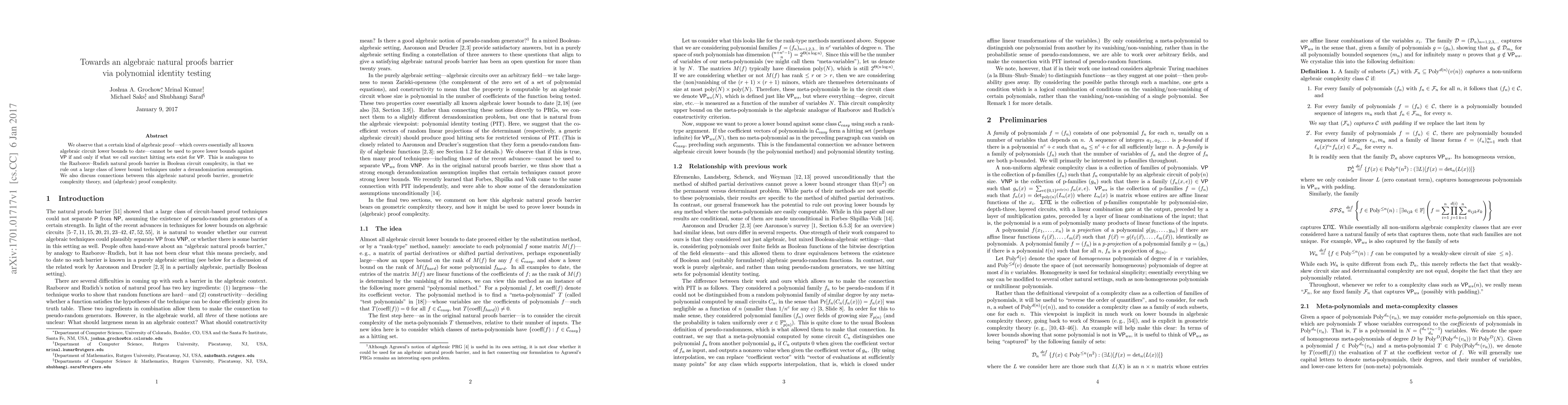 Researchers found that certain algebraic proofs are insufficient to prove lower bounds against VP if succinct hitting sets exist for VP, establishing a barrier to natural proofs in this context. This connection to the Razborov-Rudich natural proofs barrier has implications for Boolean circuit complexity and geometric complexity theory.