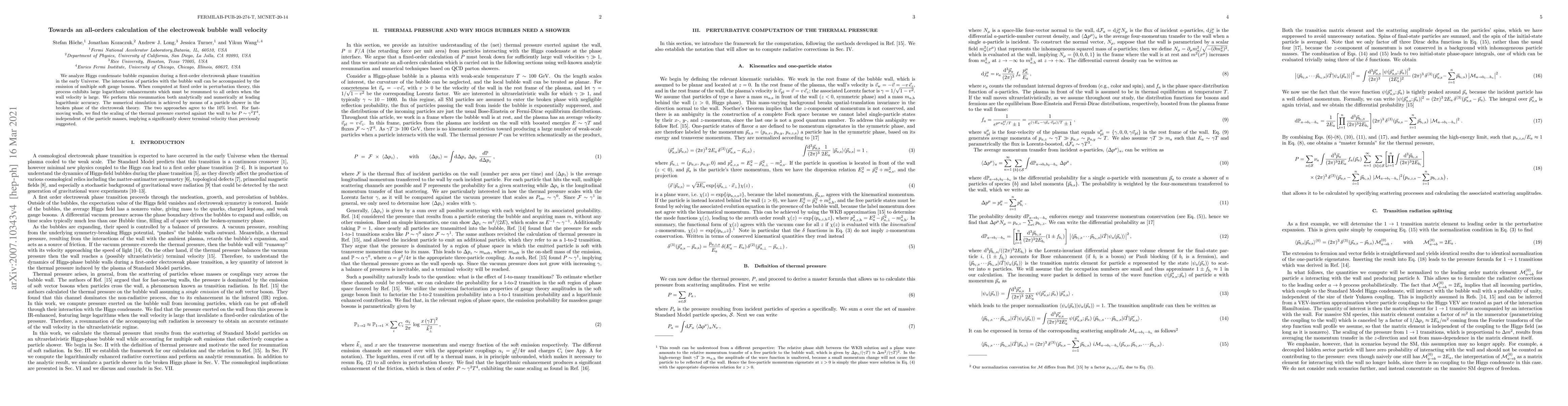 We analyze Higgs condensate bubble expansion during a first-order electroweak phase transition in the early Universe. The interaction of particles with the bubble wall can be accompanied by the emission of multiple soft gauge bosons. When computed at fixed order in perturbation theory, this process exhibits large logarithmic enhancements which must be resummed to all orders when the wall velocity is large. We perform this resummation both analytically and numerically at leading logarithmic accuracy. The numerical simulation is achieved by means of a particle shower in the broken phase of the electroweak theory. The two approaches agree to the 10\% level. For fast-moving walls, we find the scaling of the thermal pressure exerted against the wall to be $P\sim \gamma^2T^4$, independent of the particle masses, implying a significantly slower terminal velocity than previously suggested.