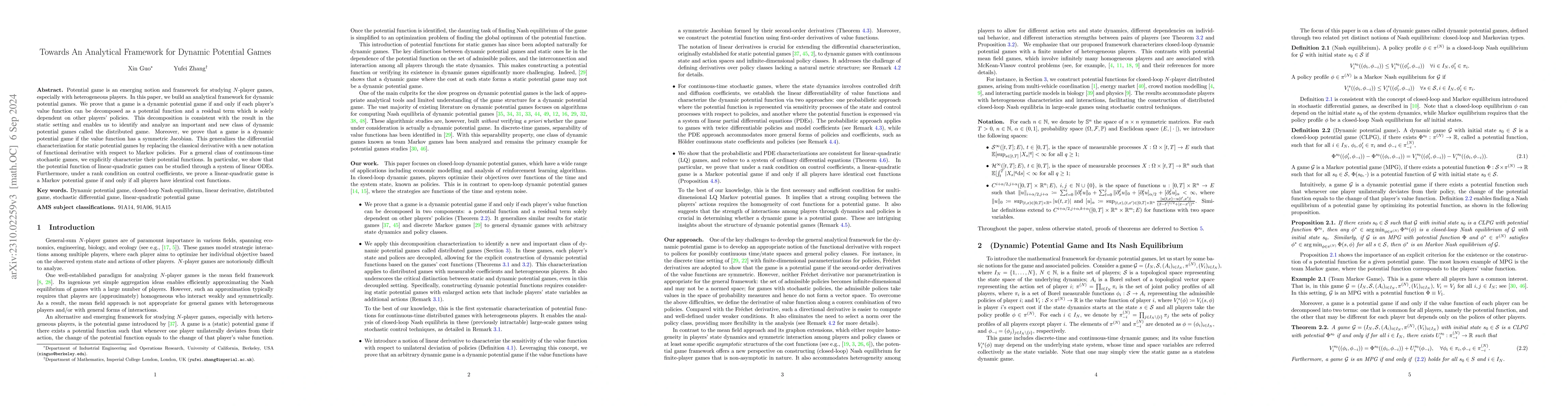 This paper develops an analytical framework for potential games, proving that such games can be decomposed into potential functions and residual terms dependent on other agents' actions. It introduces a new class of distributed games and shows that potential games have symmetric Jacobians, providing probabilistic and PDE approaches for characterizing potential functions in continuous-time stochastic games.