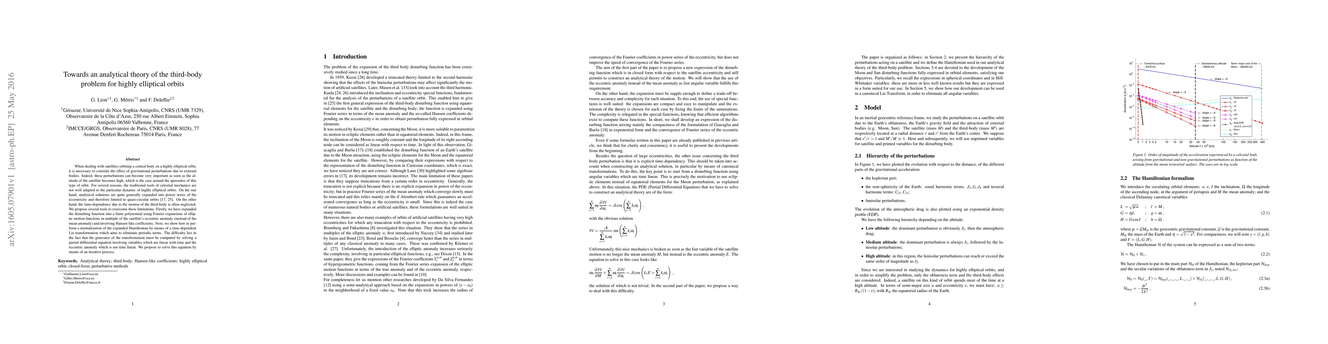 When dealing with satellites orbiting a central body on a highly elliptical orbit, it is necessary to consider the effect of gravitational perturbations due to external bodies. Indeed, these perturbations can become very important as soon as the altitude of the satellite becomes high, which is the case around the apocentre of this type of orbit. For several reasons, the traditional tools of celestial mechanics are not well adapted to the particular dynamic of highly elliptical orbits. On the one hand, analytical solutions are quite generally expanded into power series of the eccentricity and therefore limited to quasi-circular orbits [17, 25]. On the other hand, the time-dependency due to the motion of the third-body is often neglected. We propose several tools to overcome these limitations. Firstly, we have expanded the disturbing function into a finite polynomial using Fourier expansions of elliptic motion functions in multiple of the satellite's eccentric anomaly (instead of the mean anomaly) and involving Hansen-like coefficients. Next, we show how to perform a normalization of the expanded Hamiltonian by means of a time-dependent Lie transformation which aims to eliminate periodic terms. The difficulty lies in the fact that the generator of the transformation must be computed by solving a partial differential equation involving variables which are linear with time and the eccentric anomaly which is not time linear. We propose to solve this equation by means of an iterative process.