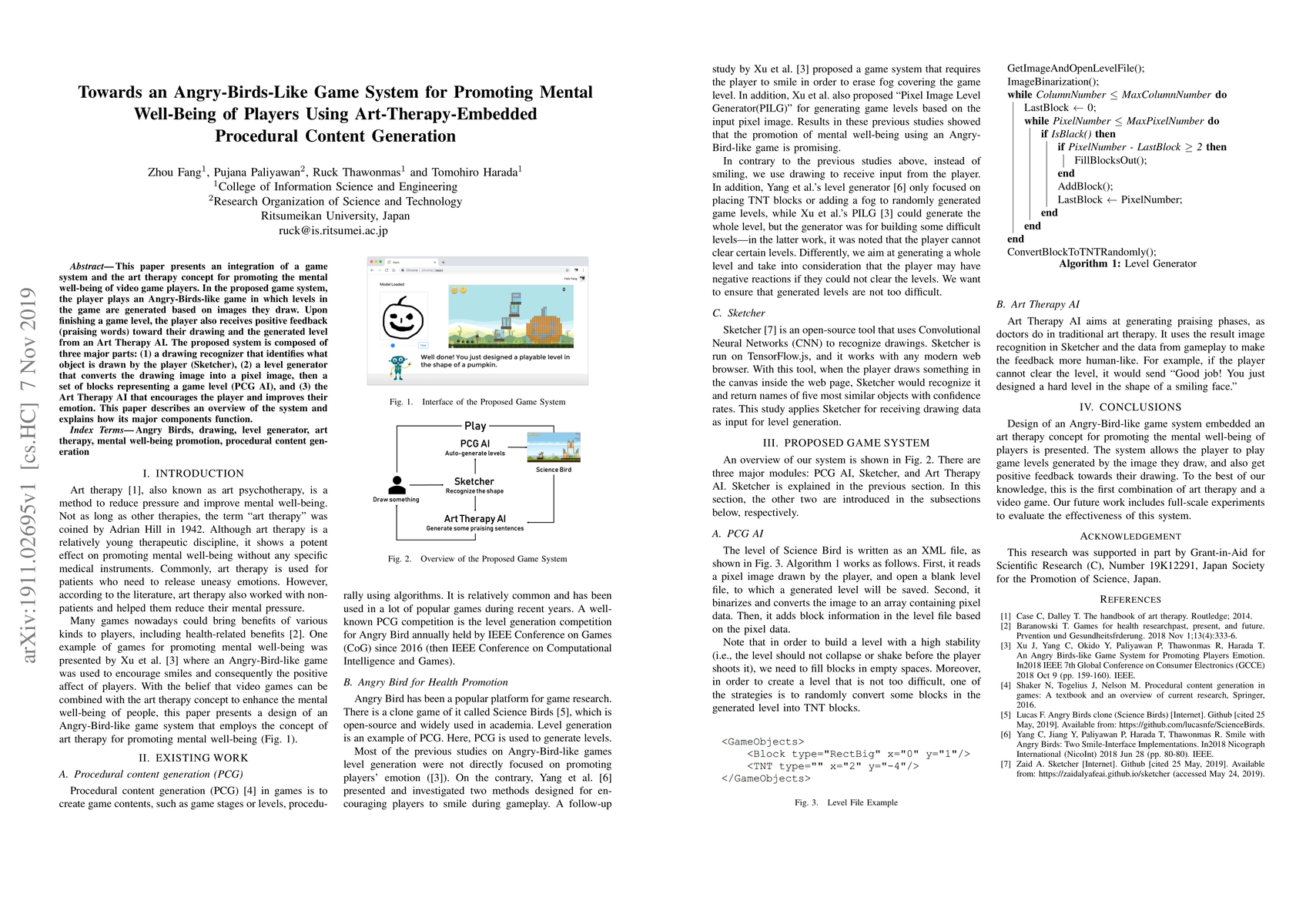 This paper presents an integration of a game system and the art therapy concept for promoting the mental well-being of video game players. In the proposed game system, the player plays an Angry-Birds-like game in which levels in the game are generated based on images they draw. Upon finishing a game level, the player also receives positive feedback (praising words) toward their drawing and the generated level from an Art Therapy AI. The proposed system is composed of three major parts: (1) a drawing recognizer that identifies what object is drawn by the player (Sketcher), (2) a level generator that converts the drawing image into a pixel image, then a set of blocks representing a game level (PCG AI), and (3) the Art Therapy AI that encourages the player and improves their emotion. This paper describes an overview of the system and explains how its major components function.