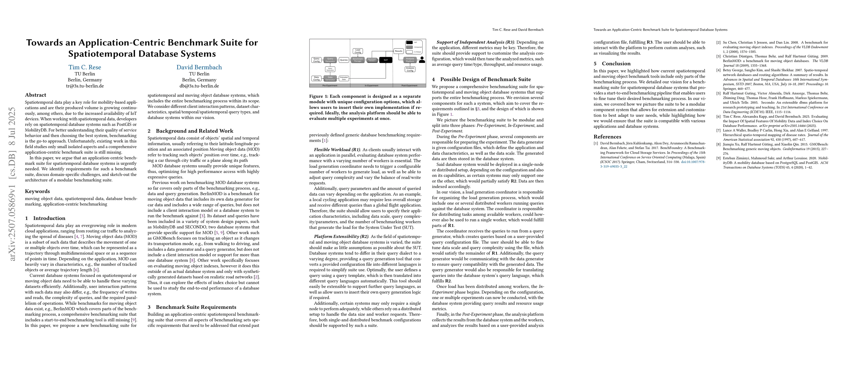 The paper outlines a modular benchmark suite architecture for spatiotemporal and moving object database systems, addressing specific requirements such as flexible workload, platform extensibility, and independent analysis support.