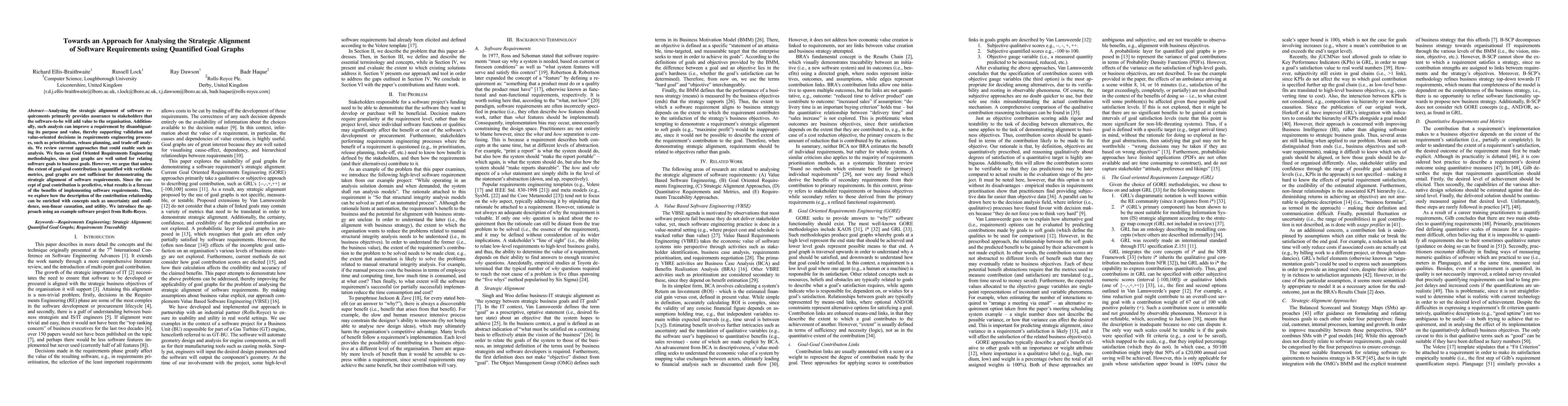 Analysing the strategic alignment of software requirements primarily provides assurance to stakeholders that the software-to-be will add value to the organisation. Additionally, such analysis can improve a requirement by disambiguating its purpose and value, thereby supporting validation and value-oriented decisions in requirements engineering processes, such as prioritisation, release planning, and trade-off analysis. We review current approaches that could enable such an analysis. We focus on Goal Oriented Requirements Engineering methodologies, since goal graphs are well suited for relating software goals to business goals. However, we argue that unless the extent of goal-goal contribution is quantified with verifiable metrics, goal graphs are not sufficient for demonstrating the strategic alignment of software requirements. Since the concept of goal contribution is predictive, what results is a forecast of the benefits of implementing software requirements. Thus, we explore how the description of the contribution relationship can be enriched with concepts such as uncertainty and confidence, non-linear causation, and utility. We introduce the approach using an example software project from Rolls-Royce.