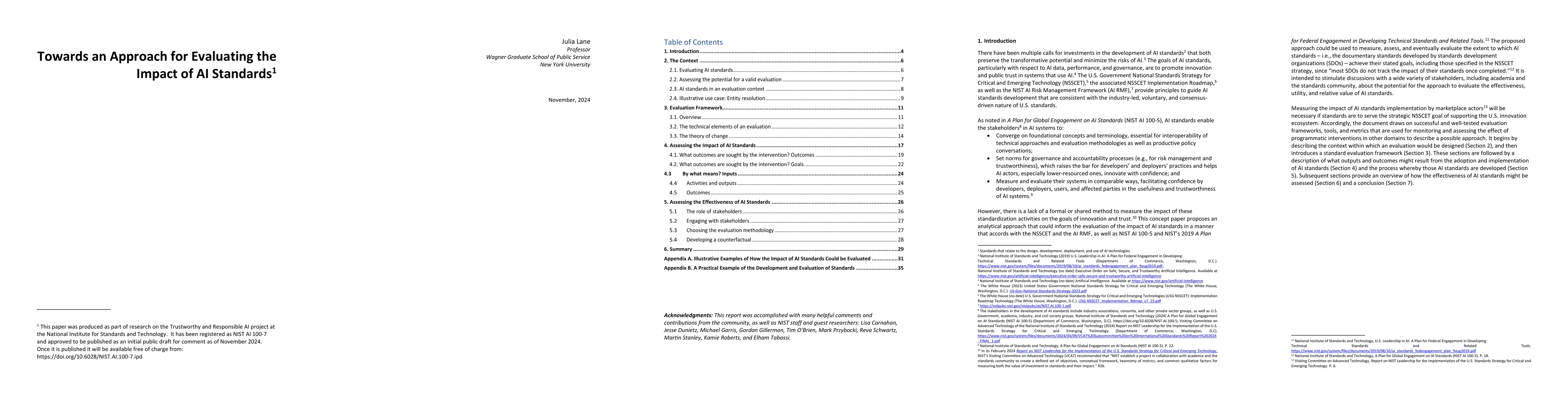 There have been multiple calls for investments in the development of AI standards that both preserve the transformative potential and minimize the risks of AI. The goals of AI standards, particularly with respect to AI data, performance, and governance, are to promote innovation and public trust in systems that use AI. However, there is a lack of a formal or shared method to measure the impact of these standardization activities on the goals of innovation and trust. This concept paper proposes an analytical approach that could inform the evaluation of the impact of AI standards. The proposed approach could be used to measure, assess, and eventually evaluate the extent to which AI standards achieve their stated goals, since most Standards Development Organizationss do not track the impact of their standards once completed. It is intended to stimulate discussions with a wide variety of stakeholders, including academia and the standards community, about the potential for the approach to evaluate the effectiveness, utility, and relative value of AI standards. The document draws on successful and well-tested evaluation frameworks, tools, and metrics that are used for monitoring and assessing the effect of programmatic interventions in other domains to describe a possible approach. It begins by describing the context within which an evaluation would be designed, and then introduces a standard evaluation framework. These sections are followed by a description of what outputs and outcomes might result from the adoption and implementation of AI standards and the process whereby those AI standards are developed . Subsequent sections provide an overview of how the effectiveness of AI standards might be assessed and a conclusion.