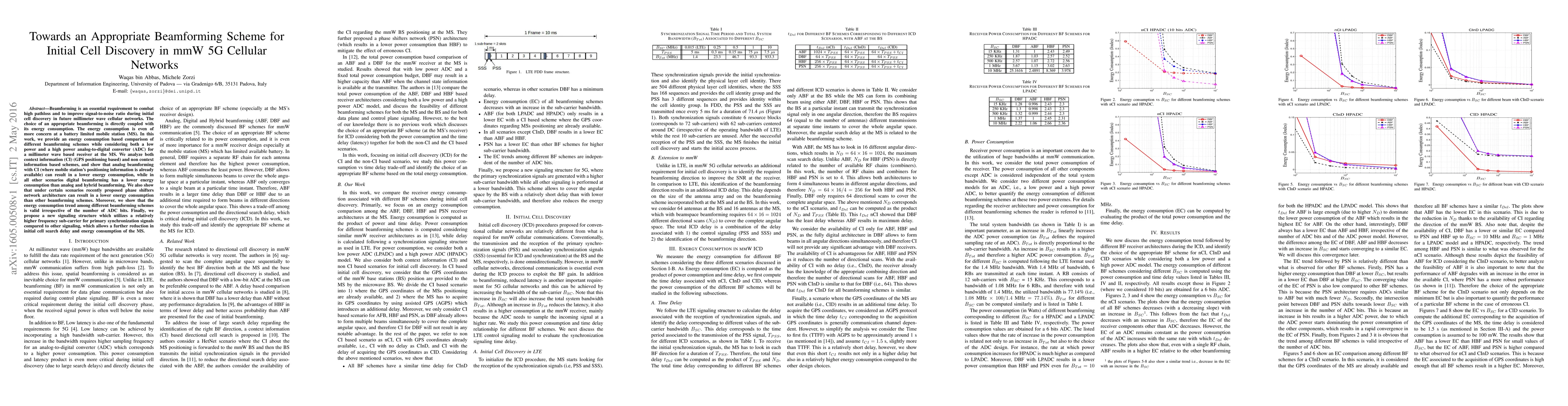This paper compares various beamforming schemes for initial cell discovery in mmW 5G networks, focusing on energy consumption. It finds that analog beamforming with context information can be more energy-efficient, while digital beamforming generally outperforms others in non-context scenarios. The study also proposes a new signaling structure to reduce search delay and energy consumption.