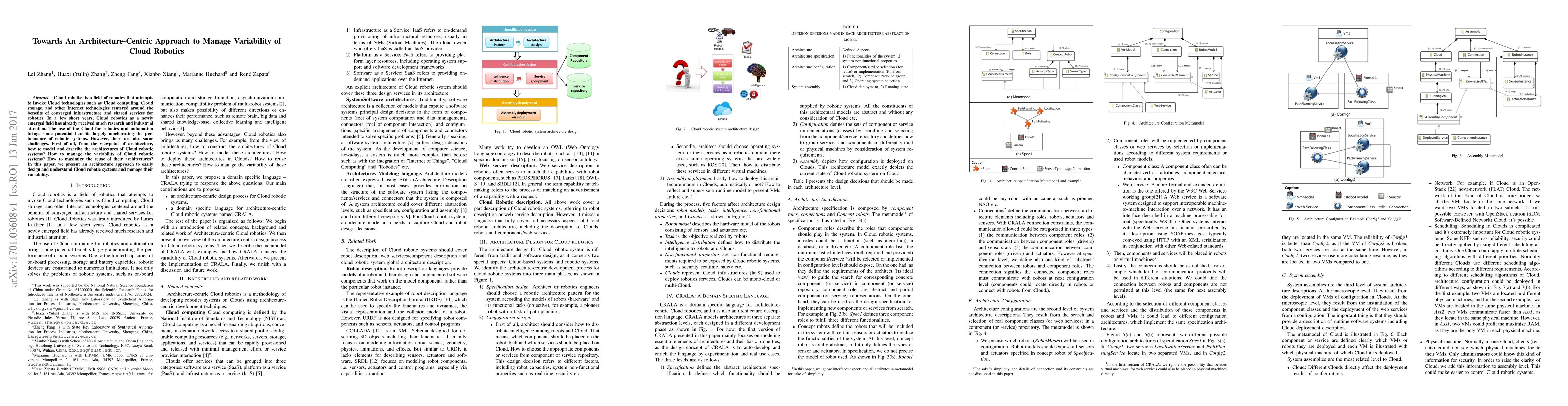 The research presents an architecture-centric approach for designing and understanding Cloud robotic systems, focusing on managing their variability and maximizing architecture reuse. It introduces CRALA, a domain-specific language for architecture description in Cloud robotics, modeled at three abstraction levels: specification, configuration, and assembly.