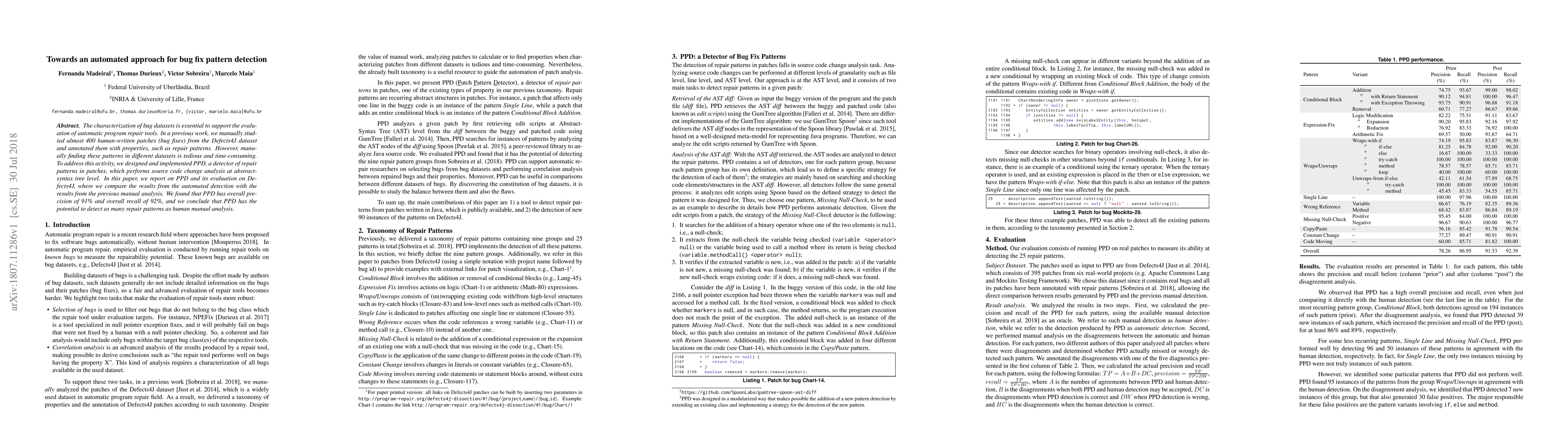 This paper introduces PPD, an automated tool for detecting repair patterns in software patches, and evaluates its performance on the Defects4J dataset. PPD analyzes source code changes at the abstract-syntax tree level, achieving 91% precision and 92% recall, indicating it can effectively replicate the results of previous manual analyses.